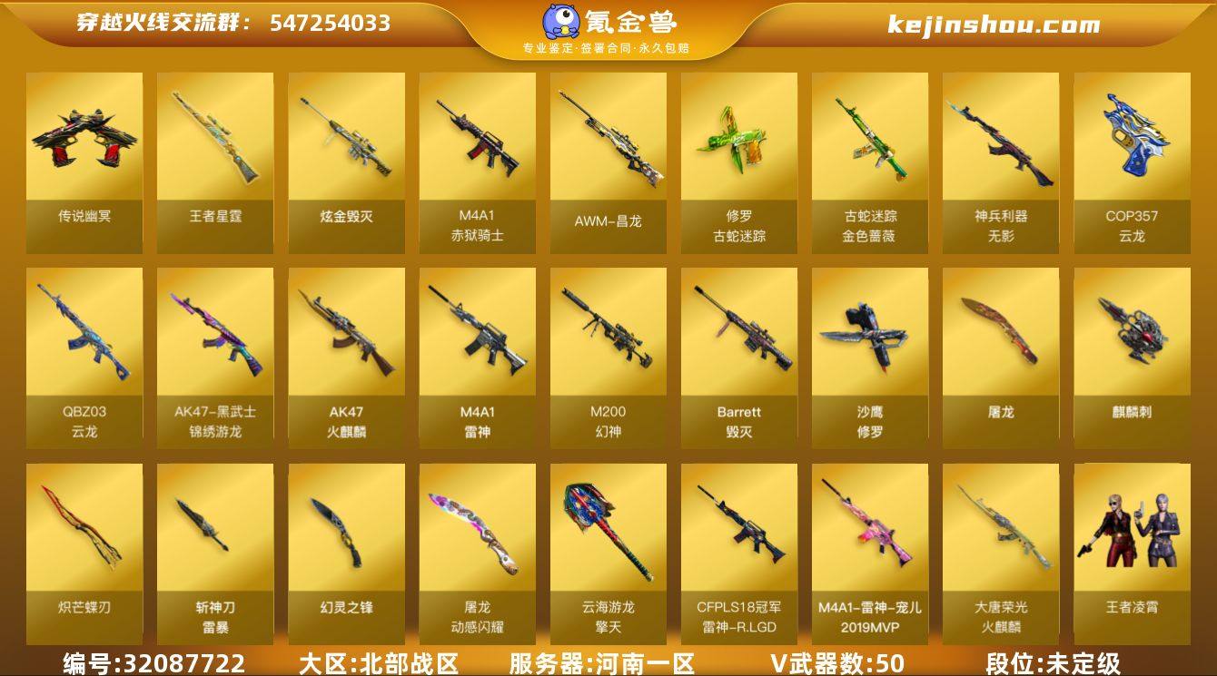 河南一区-52V-5王者武器数-1炫金武器数 【传说武器】:传说幽冥 【热门武器】:传说幽冥,M200-幻神,金色蔷薇-古蛇迷踪,修罗-古蛇迷踪,沙鹰-修罗,炽芒蝶刃 【王者炫金武器】:王者星霆,王者玉锋,炫金毁灭 【音效卡】:炼狱-百战金芒-庆典舞曲音效卡,柯尔特-百战金芒-庆典舞曲音效卡 【皮肤】:M200-幻神-N9-2022MVP,雷神-宠儿-2019MVP,雷神-R.LGD-CFPLS18冠军,M4A1-再燃火线,火麒麟-大唐荣光,屠龙-惊鸿 皮肤,轻型军用手斧-再燃火线,麒麟刺-甜蜜糖果 皮肤,麒麟刺-月皮肤 【角色】:隼,战地猎狐,王者凌霄,雪域霜狐,蛇隐宗,奇洋探员,云海玲珑,电竞少女,嘉年华灵狐,0号玩家,潘多拉-甜心教官,蛇姬,斯沃特-X 【人偶武器】:AWM-灵狐-15周年嘉年华,迷你波特博士,夺魂,生化手雷-机甲核心,深渊终结者手雷,灵狐娃娃手雷 【暴走生化】:超级对讲机 【挑战大师】:冰龙粉碎者-白马银枪 【英雄级武器】:AK47-火麒麟,M4A1-雷神,无影-神兵利器,QBZ03-云龙,黑武士-锦绣游龙,金色蔷薇-古蛇迷踪,Barrett-毁灭,M200-幻神,炼狱-百战金芒,沙鹰-修罗,COP 357-云龙,USP-冥王,修罗-古蛇迷踪,屠龙,麒麟刺,幻灵之锋,炽芒蝶刃,擎天-云海游龙,斩神刀-雷暴,麒麟刺-百战金芒,高爆手雷-雷霆,高爆手雷-雷暴,高爆手雷-幻灵*2,高爆手雷-云龙*2,手雷-云海游龙,手雷-热带奇洋,高爆手雷-古蛇迷踪,高爆手雷-玄豹,闪光弹-雷霆,闪光弹-雷暴,闪光弹-幻灵*2,闪光弹-竞技荣光,闪光弹-云龙*2,闪光弹-玄豹,闪光弹-雷霆王者-觉醒版,烟雾弹-雷霆,烟雾弹-雷暴,烟雾弹-幻灵*2,烟雾弹-云龙*2,烟雾弹-古蛇迷踪,烟雾弹-玄豹,烟雾弹-雷霆王者-觉醒版,烟雾弹-荣耀世冠EP,M4A1-赤狱骑士,AWM-昌龙 【道具】:CFS限定背包,全能枪王背包,古蛇迷踪炫彩背包,奇洋探员-海龟背包,百战金芒炫彩...
