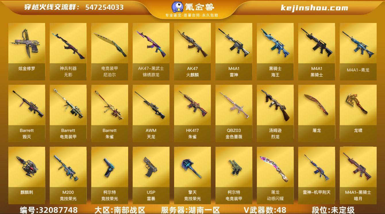 湖南一区-51V-1王者武器数-2炫金武器数 【热门武器】:QBZ03-金色蔷薇,M14EBR-玄武,HK417-朱雀*2,M4A1-青龙,M200-竞技荣光,M4A1-黑骑士,汤姆逊-烈龙,USP-雷暴 【王者炫金武器】:炫金武士,炫金修罗 【音效卡】:M4A1-黑骑士音效卡,炼狱-百战金芒-庆典舞曲音效卡 【皮肤】:雷神-暗月,雷神-机甲刑天皮肤,雷神-源计划2.0专属 皮肤,M4A1-再燃火线,火麒麟-雷神,火麒麟-平天大圣*2,火麒麟-心动糖果,毁灭-青帝,黑骑士-暗月,战神-紫绶金章皮肤,轻型军用手斧-再燃火线 【角色】:魅影,电竞教官-云悠悠,乔伊教练,修道士,空,暗夜-X,初恋灵狐,飞虎队-X,风暴女,嘉年华灵狐,兰-新年限定,曼陀罗-X,邱刚敖,斯沃特-X,蜀雪,新娜塔莎,雪莉杨,樱-战斗天使,影武者-X 【人偶武器】:天龙-曼陀罗,火麒麟-灵狐,M4A1-雷神-精英刀锋,AWM-灵狐-15周年嘉年华,M37-葵,夺魂,生化手雷-机甲核心,Barrett-夜玫瑰,M200-夜玫瑰 【暴走生化】:超级对讲机 【挑战大师】:冰龙粉碎者-白马银枪,激光毁灭者III-白马银枪,神圣爆裂者-末日III 【英雄级武器】:AK47-火麒麟*2,M4A1-雷神*2,M4A1-黑骑士,M4A1-青龙,HK417-朱雀*2,M14EBR-玄武,无影-神兵利器,黑武士-锦绣游龙,QBZ03-金色蔷薇,黑骑士-海王*2,王者白虎-觉醒版,AWM-天龙,Barrett-毁灭,Barrett-朱雀,Barrett-电竞装甲,M200-竞技荣光,炼狱-百战金芒,汤姆逊-烈龙,USP-雷暴,柯尔特-电竞装甲,柯尔特-竞技荣光,屠龙,龙啸,麒麟刺,擎天-竞技荣光,尼泊尔-电竞装甲,麒麟刺-百战金芒,高爆手雷-竞技荣光,闪光弹-竞技荣光,烟雾弹-竞技荣光 【道具】:CFS限定背包,炫彩背包,百战金芒炫彩背包,超级背包,女皇终结者-魔龙之吻,妩媚妖姬,绿色巨人,灵魂忍者*2,妖姬,迷雾幽灵,生化弹匣,夺命之镰,防化服*3,金色流光-枪王排位*...