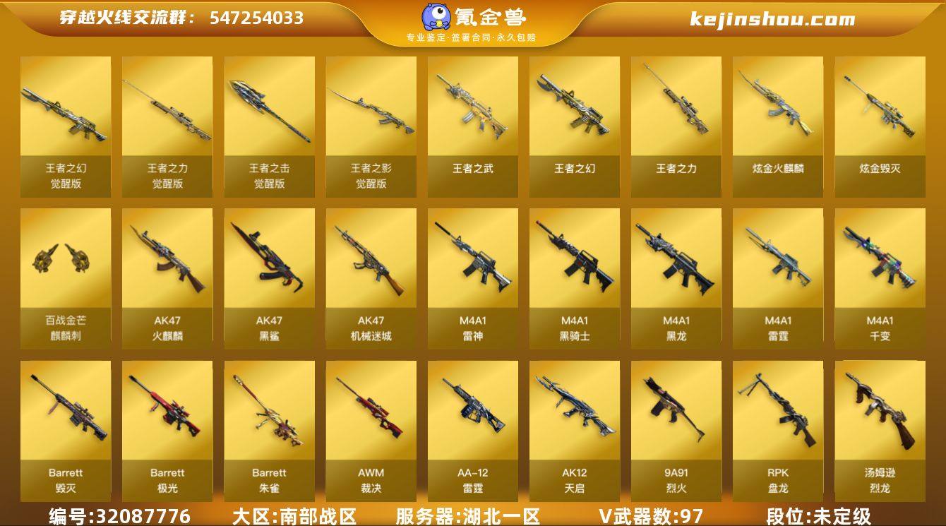 MCF680【南部湖北一区】【97V15王者7炫金】【5盘龙+1炼狱 雷霆套 6修罗 6烈龙 死亡之眼 】【王者武器】 王者之心觉醒版 王者之影觉醒版 王者之光觉醒版 王者之啸觉醒版 王者之击觉醒版 王者之幻 王者之武 王者之力 王者之怒x2 王者之灵x3 王者之锋x2 【炫金武器】 炫金火麒麟 炫金雷神x2 炫金骑士x3 炫金毁灭 【英雄武器】 M4A1-千变 AK47-火麒麟 M4A1-黑龙 M4A1-雷神 M4A1-黑骑士 AK12-天启 AK47-机械迷城 AK47-黑鲨 M4A1-雷霆 机械迷城-穹宇 9A-91-烈火 AK47-B-战神 Barrett-毁灭 Barrett-极光 Barrett-雷霆 Barrett-朱雀 AWM-裁决 RPK-盘龙 加特林-炼狱 汤姆逊-烈龙 AA-12-雷霆 沙鹰-修罗 沙鹰-天神 COP357-雷霆 屠龙 龙啸 擎天 麒麟刺 尼泊尔-雷霆 高爆手雷-雷霆x7 烟雾弹-雷霆x7 闪光弹-雷霆 x7 【角色】 葵 零 瞳 樱 炫 【音效卡】 Barrett-碧霄极光音效卡 Barrett-毁灭音效卡 【皮肤】 毁灭耀金皮肤 火麒麟-华夏之心 雷神-虎将 火麒麟-CF STAR 天龙-CF STAR 修罗-CF STAR