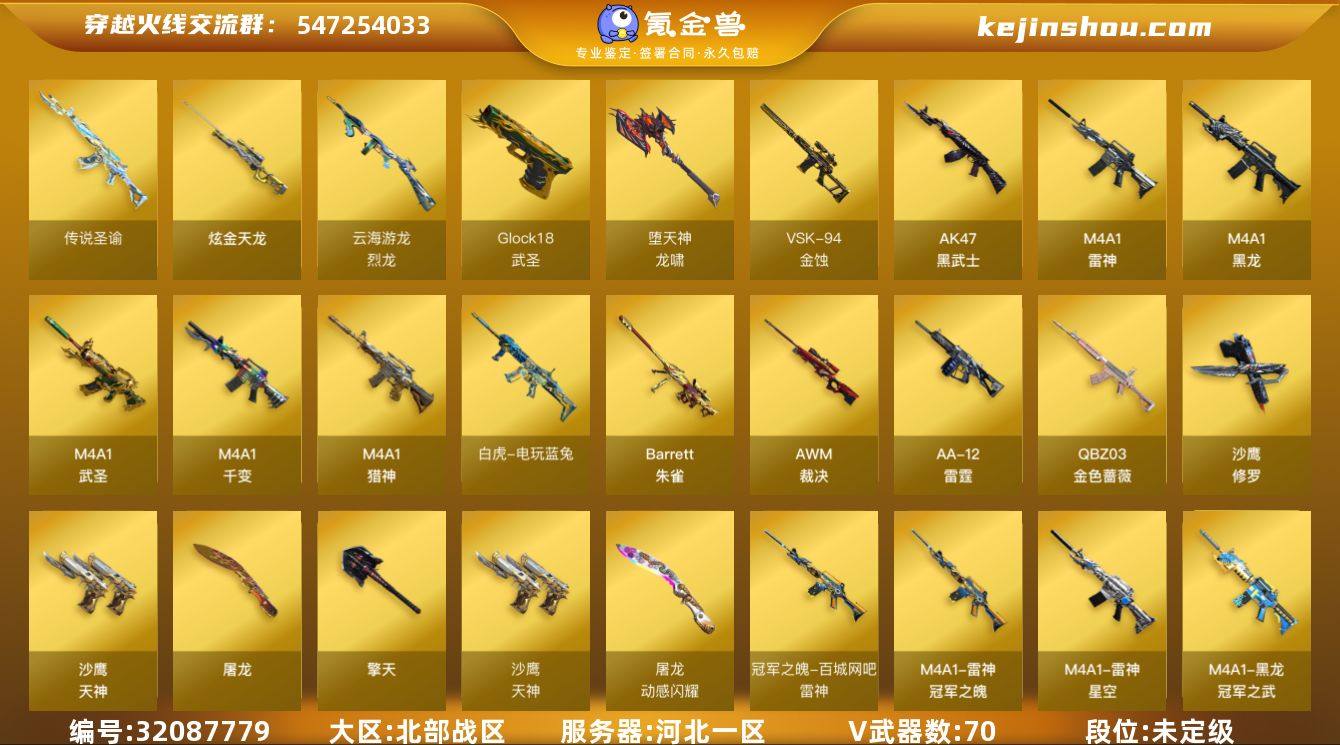 河北一区-75V-7王者武器数-1炫金武器数 【传说武器】:传说圣谕 【传说角色】:传说星骇 【热门武器】:传说圣谕,QBZ03-金色蔷薇,白虎-电玩蓝兔,加特林-炼狱,沙鹰-修罗*2 【王者炫金武器】:炫金天龙 【音效卡】:AWM-裁决音效卡*2,QBZ03-天罚音效卡,Barrett-碧霄极光音效卡,炼狱-百战金芒-庆典舞曲音效卡 【皮肤】:白虎-大汉风骨,雷神-星空,雷神-冠军之魄,M4A1-再燃火线,毁灭-星空,黑龙-冠军之武,轻型军用手斧-再燃火线 【角色】:机械姬,战地猎狐,雪域霜狐,乔伊教练,云海玲珑,暗夜-X,初恋灵狐,风暴女*2,娟娟,兰妹妹,龙儿,龙儿-小淘气,蜀雪,铁骑荣耀 【人偶武器】:M37-葵,COP-旗袍,生化手雷-机甲核心 【挑战大师】:冰龙粉碎者-白马银枪,激光毁灭者III-白马银枪 【英雄级武器】:M4A1-千变,M4A1-黑龙,M4A1-雷神,AK47-黑武士,M4A1-武圣,QBZ03-天罚*2,FAMAS G2-天戎,SCAR Light-玄豹,QBZ03-独角-III,QBZ03-金色蔷薇,M4A1-猎神,王者之鲨-觉醒版,白虎-电玩蓝兔,王者猎神-觉醒版*2,王者玄武-觉醒版,AWM-裁决*3,Barrett-朱雀,VSK-94-金蚀,加特林-炼狱,炼狱-百战金芒,烈龙-云海游龙,AA-12-雷霆,沙鹰-修罗*2,沙鹰-天神*4,Anaconda-玄豹,USP-冥王,Glock18-武圣,屠龙,擎天*2,龙啸-堕天神,麒麟刺-百战金芒,丛林匕首-玄豹*2,王者冰锋-觉醒版*2,高爆手雷-雷暴,高爆手雷-堕天神,高爆手雷-玄豹*5,闪光弹-雷暴*2,闪光弹-堕天神*2,闪光弹-玄豹*6,烟雾弹-雷暴,烟雾弹-堕天神,烟雾弹-玄豹*5,M4A1-苍鸣雷神,Barrett-碧霄极光*2 【道具】:BS战队炫彩背包,云山科技背包,女皇终结者-背包,百战金芒炫彩背包,雪域霜狐炫彩背包,黑桃战神背包,女皇终结者-魔龙之吻,救世主-黑桃战神,绿色巨人,灵魂忍者,妖姬,迷雾幽灵,夺命之镰,防化服*3,流光-鎏金...