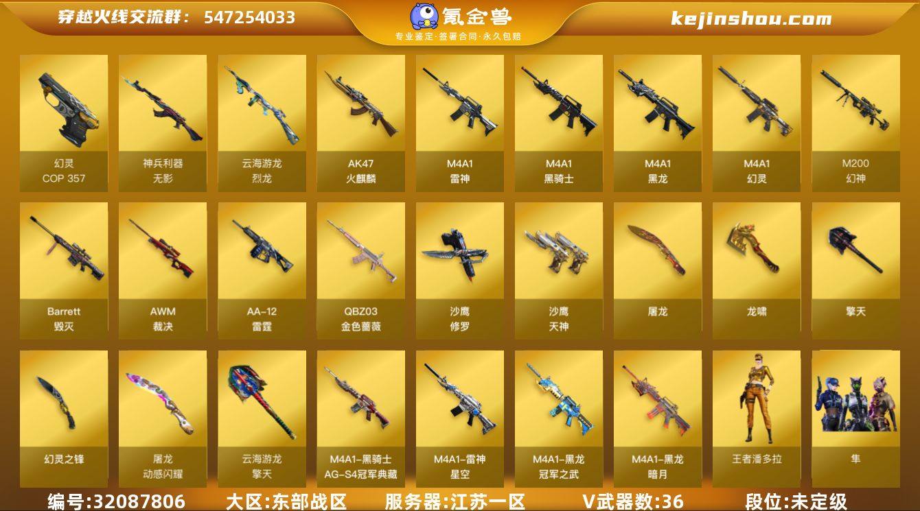江苏一区-42V-2王者武器数-0炫金武器数 【热门武器】:QBZ03-金色蔷薇,M14EBR-玄武,M200-幻神,死亡之眼*3,M4A1-黑骑士,雷神-小红,COP-白鲨*2,COP 357-幻灵,沙鹰-修罗*2,Knife-冠军之刃 【音效卡】:M4A1-黑骑士音效卡 【皮肤】:幻神-冠军之幻,QBZ03-荣耀世冠白鲨,金色蔷薇-破浪逐光 皮肤,金色蔷薇-电竞之星 皮肤,雷神-星空,M4A1-雷神-巅峰荣耀皮肤,雷神-源计划2.0专属 皮肤,黑龙-暗月,黑龙-冠军之武,黑骑士-AG-S4冠军典藏,修罗-能量核心,屠龙-破浪逐光 皮肤,龙啸-冠军之啸 【角色】:葵,鹰,隼,王者潘多拉,修道士,云海玲珑,嘉年华灵狐,荆棘玫瑰,灵狐者-X,麻雀 【人偶武器】:雷神-小红,COP-白鲨*2,AWM-灵狐-15周年嘉年华,迷你波特博士*2,迷你火种*2 【暴走生化】:死亡之眼*3 【挑战大师】:激光毁灭者III-白马银枪,激光毁灭者III,试炼破坏者III 【英雄级武器】:AK47-火麒麟,M4A1-黑龙,M4A1-雷神,M4A1-黑骑士,M4A1-幻灵,M14EBR-玄武,无影-神兵利器,QBZ03-金色蔷薇,HK417-朱雀-电竞之星,Barrett-毁灭,AWM-裁决,M200-幻神,王者风神-觉醒版,王者凰鸣-觉醒版,烈龙-云海游龙,AA-12-雷霆,沙鹰-修罗*2,沙鹰-天神*2,COP 357-幻灵,屠龙,龙啸,擎天,幻灵之锋,擎天-云海游龙,高爆手雷-幻灵*2,高爆手雷-竞技荣光,高爆手雷-云龙,手雷-云海游龙,闪光弹-幻灵*2,闪光弹-云龙,烟雾弹-幻灵*2 【道具】:XROCK炫彩背包,云海游龙炫彩背包,夺命之镰,防化服,金色流光-枪王排位,星辰流光-枪王排位,枪王排位28赛季金色流光,枪王排位29赛季金色流光,云海游龙表情,防弹头盔*3,防弹衣*3,C4工具钳*3,手雷包*3 【特殊枪械】:1黑骑士