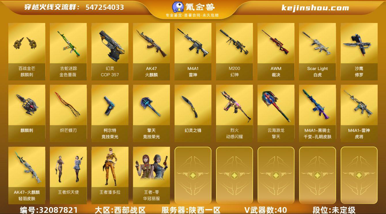 陕西一区-41V-8王者-0炫金 【热门武器】:Scar Light-白虎,M200-幻神,金色蔷薇-古蛇迷踪,修罗-古蛇迷踪,COP 357-幻灵,沙鹰-修罗,炽芒蝶刃,炽芒蝶刃-破浪逐光 皮肤 【音效卡】:修罗-云海游龙音效卡 【皮肤】:幻神-宠儿-2021MVP,幻神-电竞之星 皮肤,裁决-胜者为王 皮肤,雷神-虎将,雷神-宇航兔皮肤,火麒麟-轻羽皮肤*2,火麒麟-心动糖果,M4A1-千变-孔明皮肤,炽芒蝶刃-破浪逐光 皮肤 【角色】:王者零-华冠丽服,王者潘多拉,王者炽天使,蛇隐宗,乔伊教练,云海玲珑,暗夜-X,嘉年华灵狐,娟娟,麻雀,潘多拉-X,蛇姬,斯沃特-X,兔囡囡,幽 【人偶武器】:生化手雷-机甲核心,AK12-夜玫瑰 【暴走生化】:超级对讲机 【挑战大师】:神圣爆裂者-末日III 【英雄级武器】:AK47-火麒麟,M4A1-雷神,Scar Light-白虎,金色蔷薇-古蛇迷踪,烈火-动感闪耀,AWM-裁决,M200-幻神,沙鹰-修罗,COP 357-幻灵,柯尔特-竞技荣光,天神-动感闪耀,修罗-云海游龙,修罗-古蛇迷踪,麒麟刺,幻灵之锋,擎天-竞技荣光,炽芒蝶刃,屠龙-动感闪耀,擎天-云海游龙,高爆手雷-幻灵*3,高爆手雷-竞技荣光,高爆手雷-神工天巧*2,高爆手雷-古蛇迷踪,闪光弹-雷霆,闪光弹-雷暴,闪光弹-幻灵,闪光弹-竞技荣光*2,闪光弹-神工天巧*3,烟雾弹-雷暴,烟雾弹-幻灵,烟雾弹-竞技荣光*3,烟雾弹-神工天巧,烟雾弹-古蛇迷踪 【道具】:CFS限定背包,云海游龙炫彩背包,冰冰企鹅背包,古蛇迷踪炫彩背包,战舰背包,超级背包,绿色巨人,灵魂忍者,迷雾幽灵,夺命之镰,防化服*2,金色流光-枪王排位*2,星辰流光-枪王排位,枪王排位28赛季金色流光,枪王排位29赛季金色流光,古蛇迷踪打击特效,蛇隐宗表情,动感闪耀表情,云海游龙表情,EP战队名片,EP战队击杀图标,防弹头盔*3,防弹衣*3,C4工具钳*2,手雷包*2 【特殊枪械】:1白虎