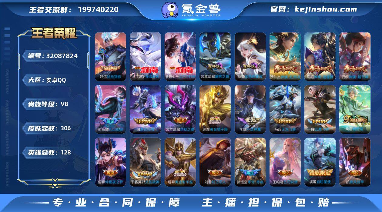 13县标,10印记,17按键,改名卡,【星元皮肤】:刘备时之思念,宫本武藏幽冥之眼,貂蝉金色仲夏夜【英雄全皮】:敖隐全皮【荣耀典藏】:韩信弑枪猎影【珍品传说】:鲁班七号江户川柯南,马可波罗怪盗基德【传说皮肤】:云缨神骥越千峰,狄仁杰神骥赴朔漠,马超神骥逐星野,司马懿九山相柳,桑启鸣野蒿,澜逐花归海,马超无双飞将,王昭君乞巧织情,铠绛天战甲,虞姬启明星使,孙悟空零号赤焰,曜云鹰飞将,李信一念神魔,刘备时之恋人,干将莫邪久胜战神,达摩黄金狮子座,后羿黄金射手座,貂蝉仲夏夜之梦,宫本武藏地狱之眼【限定皮肤】:白起狰,姜子牙天穹之誓,杨戬破阵退雄兵,李白谪仙醉月,狄仁杰阴阳师,赵云皇家上将,孙尚香蔷薇恋人,庄周高山流水,钟无艳超时空战士,元歌云间偶戏,元歌无心,夏侯惇朔风刀,甄姬落雪兰心,典韦岱宗,马可波罗山海玄木吟,狄仁杰魔术师,狄仁杰万华元夜,达摩沙漠行僧,项羽海滩派对,老夫子醍醐杖,程咬金演武夺筹,兰陵王金庭之子,孙悟空至尊宝,孙悟空零号赤焰,孙悟空孙行者,李元芳云中旅人,虞姬启明星使,钟馗驱傩正仪,鬼谷子原初探秘者,鬼谷子五谷丰年,弈星混沌棋,明世隐疑决卦,裴擒虎李小龙,裴擒虎擒涛扼浪,米莱狄胡桃异想国,云中君纤云弄巧,上官婉儿梁祝,嫦娥拒霜思,嫦娥暖冬兔眠,鲁班大师探海日志,桑启海盐诗旅,暃星界游侠,艾琳女武神,阿古朵江河有灵,张良古海寻踪,蒙恬荣光圣徽,鬼谷子天穹祈灯,伽罗琥珀纪元,姬小满妄想食味,沈梦溪龙舞盛年,鲁班七号蔬乡物语,李元芳蔬乡物语,刘邦剑破天穹,上官婉儿群星魔术团,程咬金群星魔术团,镜青焰无极,项羽苍威无极,刘备异域游侠,芈月浮光幕影,周瑜熔金海岸【史诗皮肤】:周瑜线条小狗,小乔线条小狗,项羽九幽镇关,少司缘巫礼祀神,女娲万灵启世,百里玄策罗小黑战记,莱西奥光弋...