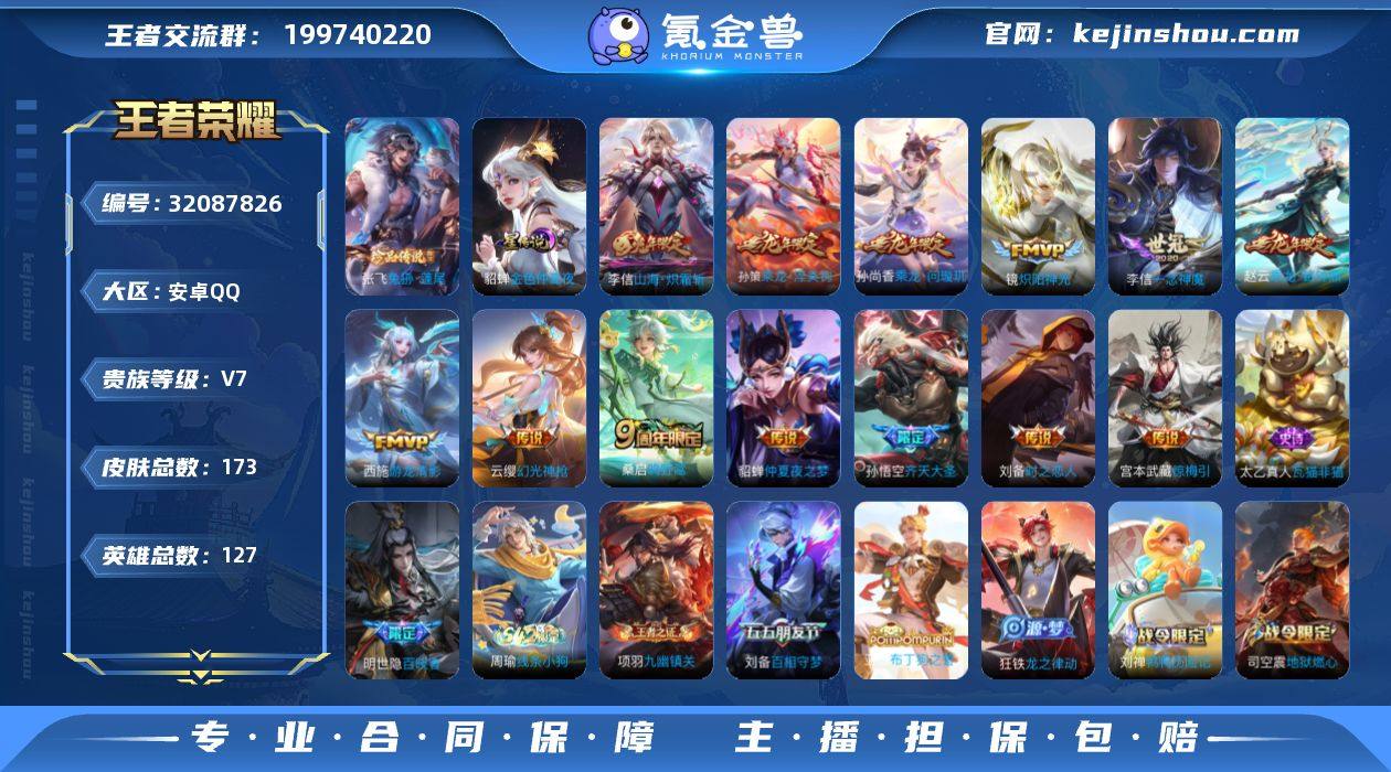 贵族等级:V7 典藏皮肤数:0 珍品无双皮肤数:0 无双皮肤数:0 珍品传说皮肤数:1 传说皮肤数:13 史诗皮肤数:51 皮肤数:173 英雄数:127 段位:非凡王者