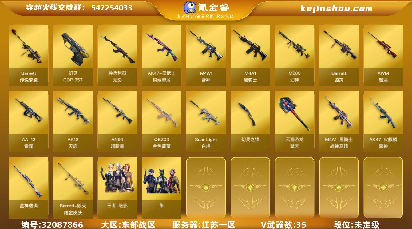 江苏一区-36V-2王者-0炫金 【传说武器】:传说梦魇 【传说角色】:传说星骇 【热门武器】:传说梦魇,QBZ03-金色蔷薇,Scar Light-白虎,M200-幻神,M4A1-黑骑士,加特林-炼狱,COP 357-幻灵 【王者炫金武器】:王者冰锋 【音效卡】:Barrett-极光音效卡,AWM-裁决音效卡 【皮肤】:幻神-纸灯龙皮肤,白虎-大汉风骨,金色蔷薇-纸灯龙皮肤,裁决-叶芒苍灵 皮肤,星神-璀璨皮肤,雷神-维纳斯皮肤,火麒麟-雷神*2,毁灭耀金皮肤,黑骑士-战神马超 【角色】:隼,王者-魅影,云海玲珑,暗夜-X,初恋灵狐,电竞少女,风暴女,嘉年华灵狐,兰-空鹰,猎狐者-追月,灵狐者-X,麻雀,潘多拉-X,青霞仙子,蜀雪,维纳斯,新娜塔莎,夜玫瑰-宠粉,影武者-X,游珑儿 【人偶武器】:白虎-迷你小艾,AWM-灵狐-15周年嘉年华,迷你牛牛,灵狐娃娃手雷 【暴走生化】:黑龙吞噬者 【挑战大师】:冰龙粉碎者-白马银枪,激光毁灭者III-白马银枪 【英雄级武器】:M4A1-雷神,M4A1-黑骑士,AK12-天启,AN94-超新星,Scar Light-白虎,无影-神兵利器,黑武士-锦绣游龙,QBZ03-金色蔷薇,QBZ-03-王者蔷薇-觉醒版,Barrett-毁灭,AWM-裁决,M200-幻神,加特林-炼狱,AA-12-雷霆,COP 357-幻灵,幻灵之锋*3,擎天-云海游龙,高爆手雷-幻灵*5,手雷-云海游龙,闪光弹-幻灵*5,烟雾弹-幻灵*5 【道具】:冰冰企鹅背包,绿色巨人,夺命之镰,防化服*2,金色流光-枪王排位*2,星辰流光-枪王排位,枪王排位28赛季金色流光,云海游龙表情,防弹头盔*2,防弹衣*2,C4工具钳*2,手雷包*2 【特殊枪械】:1白虎,1黑骑士,1炼狱