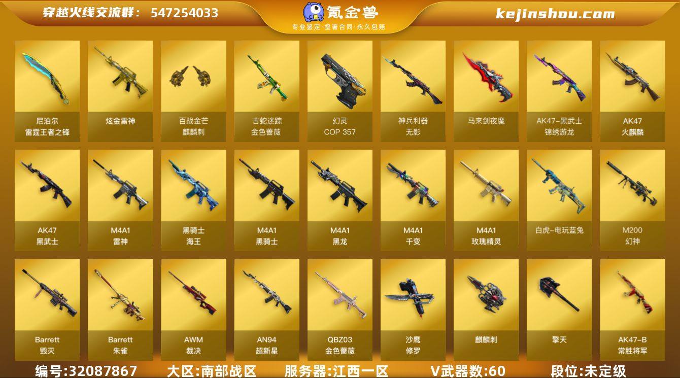 江西一区-64V-10王者-2炫金 【热门武器】:QBZ03-金色蔷薇,M14EBR-玄武,M200-幻神,金色蔷薇-古蛇迷踪,修罗-古蛇迷踪,白虎-电玩蓝兔,金色小号,牛牛-AK47,M4A1-黑骑士,羊驼玩偶,COP-白鲨,COP 357-幻灵,沙鹰-修罗*2 【王者炫金武器】:雷霆王者之锋,炫金雷神,炫金武士,王者之魄高爆手雷,王者之魄闪光弹 【音效卡】:M200-幻神音效卡,M4A1-雷神音效卡,M4A1-黑骑士音效卡,Barrett-碧霄极光音效卡*2,炼狱-百战金芒-庆典舞曲音效卡 【皮肤】:幻神-降龙,幻神-荣耀世冠白鲨2023 皮肤,幻神-电竞之星 皮肤,金色蔷薇-热带奇洋 皮肤,QBZ03-荣耀世冠EP 皮肤,裁决-叶芒苍灵 皮肤,雷神-虎将,雷神-动感闪耀 皮肤,雷神-源计划2.0专属 皮肤,雷神-春花弄影 皮肤,M4A1-再燃火线,火麒麟-轻羽皮肤,毁灭-黑大圣皮肤,毁灭-风暴,毁灭-英雄计划 皮肤,黑龙-墨子皮肤,黑骑士-暗月,黑骑士-冠军之势,黑骑士-电玩青兔皮肤,战神-粉色甜心皮肤,轻型军用手斧-再燃火线,麒麟刺-月皮肤 【角色】:葵,晴雅,王者零-华冠丽服,王者炫,王者影豹,蛇隐宗,奇洋探员,乔伊教练,修道士,炽天使,飞虎队-X,风暴女,虎妞,嘉年华灵狐,葵-赛博朋克,灵狐者-X,女主播,潘多拉-甜心教官,青霞仙子,蛇姬,兔囡囡,雪莉杨,游珑儿 【人偶武器】:COP-白鲨,M4A1-雷神-精英刀锋,AWM-灵狐-15周年嘉年华,COP-旗袍,牛牛-AK47,迷你牛牛,迷你超能女侍 【挑战大师】:冰龙粉碎者-白马银枪,VEPR-12-金魔,激光毁灭者III,神圣爆裂者-末日III 【英雄级武器】:M4A1-千变,AK47-火麒麟,M4A1-黑龙,M4A1-雷神*2,M4A1-黑骑士,AK47-黑武士,AN94-超新星,M14EBR-玄武,QBZ03-天罚,无影-神兵利器,黑武士-锦绣游龙,金色蔷薇-古蛇迷踪,M4A1-玫瑰精灵,QBZ03-金色蔷薇,烈火-动感闪耀,AK-47-猩红传说,AK47-B-战神,王...