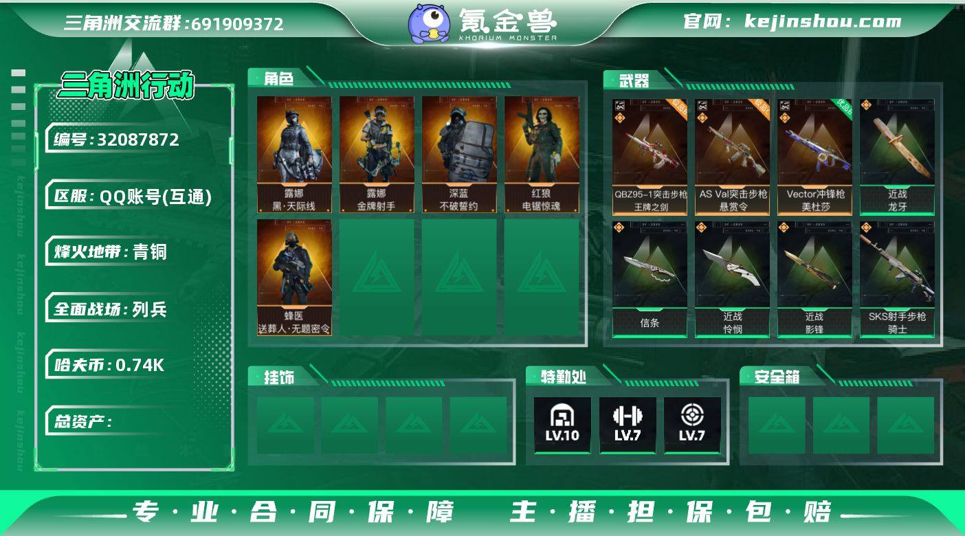 【特价出售】"总资产356.87M,哈夫币 746.42K,战场等级:50 统帅,行动等级:60 钻石,角色皮肤5,枪皮数量123【特战干员外观】露娜-黑·天际线,蜂医-送葬人·无题密令,红狼-电锯惊魂,露娜-金牌射手,深蓝-不破誓约,【近战】近战-影锋,近战-怜悯,近战-信条,近战-龙牙,近战-黑鹰,【典藏外观】Vector冲锋枪-美杜莎(优品B),QBZ95-1突击步枪-王牌之剑(极品B),AS Val突击步枪-悬赏令(极品C),Vector冲锋枪-潜袭者,P90冲锋枪-星之彩,MP7冲锋枪-黑潮,PKM通用机枪-黑潮,PKM通用机枪-黑潮,PKM通用机枪-极地勘察队,M249轻机枪-蝴蝶,M700狙击步枪-纯白涂装,AKS-74U突击步枪-蛇纹涂装,沙漠之鹰-蛇纹涂装,沙漠之鹰-蛇纹涂装,SMG-45冲锋枪-蝴蝶,M700狙击步枪-蝴蝶,SMG-45冲锋枪-斑马,【步枪】G3战斗步枪-骑士,SG552突击步枪-运动员,M16A4突击步枪-狩猎时刻,G3战斗步枪-狩猎时刻,腾龙突击步枪-捞点薯条,CAR-15突击步枪-阿米娅,AKM突击步枪-赤枭,M4A1突击步枪-阿米娅,M7突击步枪-巳蛇,ASh-12战斗步枪-鹅鸭杀,SCAR-H战斗步枪-启航,AS Val突击步枪-死神玫瑰,KC17突击步枪-电锯惊魂,SCAR-H战斗步枪-囚徒,腾龙突击步枪-无垢,AS Val突击步枪-典狱官,QBZ95-1突击步枪-曙光,AUG突击步枪-蝮蛇,K437突击步枪-守护者,M16A4突击步枪-竞赛选手,SG552突击步枪-深海恐惧,K416突击步枪-虎啸,K437突击步枪-天狼星,SCAR-H战斗步枪-荣耀列队,腾龙突击步枪-雪崩,PTR-32突击步枪-天网,AUG突击步枪-全金属外壳,AS Val突击步枪-哈夫克科技,CAR-15突击步枪-前沿科技,AS Val突击步枪-前沿科技,AUG突击步枪-前沿科技,AKS-74U突击步枪-前沿科技,M4A1突击步枪-海色,QBZ95-1突击步枪-海色,AKM突击步枪-彩墨喷涂,G3战斗步枪-山林猎人,M16A4突击步枪-山林猎人,PTR-32突击步枪-黄蜂,SG552突击步枪-彩...