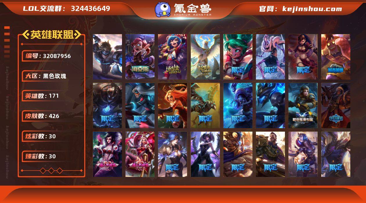WL521【黑色玫瑰343级 426皮肤 全英雄】171英雄-426皮肤-30炫彩-段位:未定级 未来战士 夺命美人卡特琳娜 泳池派对雷克顿 机械迷城加里奥 防暴士兵炼金 钢铁军团拉克丝 都铎王朝老鼠 泳池派对李青 奥斯曼大帝蛮王 诺斯费拉图 弗拉基米尔 糖果使徒费德提克 钢铁之翼艾尼维亚 蒙多蒙多蒙多 波比的巧克力工坊 冠军典狱长锤石 女猎手希维尔 创战纪希维尔 胜利女神希维尔 冠军之矛卡莉丝塔 海克斯科技吉格斯 海克斯安妮 马年锐雯 羊年金克丝 10周年安妮 10周年神凰行者瑞羽圣凰艾尼维亚 觅心猎手薇恩 觅心女王艾希 寒冬精灵璐璐 “主人不要我了”阿木木 冰雪女神辛德拉 冰雪兽纳尔 冬季仙境奥莉安娜 胡桃夹子小丑 平安夜女神琴女 魄罗骑士瑟庄妮 圣诞开心鬼提莫 圣诞精灵崔丝塔娜 圣诞狂欢努努 圣诞老人布隆 圣诞糖果棒女枪 圣诞玩偶波比 圣诞驯鹿克格莫 冰雪节茂凯 邪恶圣诞老人维迦 幸福女神乐芙兰 雪默丁格 雪装豹女 英勇玩具兵普朗克 胜利女神莫甘娜 胜利之树茂凯 胜利枪神格雷福斯 胜利女神奥利安娜 胜利之剑剑魔 胜利枪神卢锡安 胜利机器人布里茨 胜利女神瑟庄妮 S1FNC酒桶 S2暗杀星奥莉安娜 S2暗杀星蒙多 S2暗杀星努努 S2暗杀星慎 S3SKTT1劫 S3SKTT1薇恩 S4SSW锤石 S4SSW雷恩加尔 S4SSW泰隆 S4SSW老鼠 S4SSW炼金 丧尸布兰德 鬼影重重魔腾 海贼瑞兹 魅惑女巫豹女 南瓜头稻草人 无头骑士人马 陆地王者4WD布里茨 女皇艾希 冰川巨兽墨菲特 恶魔之刃蛮王 上古战魂魔腾 鬼魂新娘莫甘娜 黯黑魔龙希瓦娜 冰霜亚龙希瓦娜 绅士科加斯 战地巨兽科加斯 银河魔装机神兰博 第三类接触黑默丁格 大天使长米迦勒凯尔 战场女武神凯尔 钢铁之翼凯尔 苍穹之光韦鲁斯 律政大亨蒙多 源计划剑圣 灵能特工琴女 冰霜之刃艾瑞莉娅 恶魔男爵瑞兹 女校长菲奥娜 暗星锤石 霸天零式赛恩 红色男爵库奇 金牌主播德莱文 提莫:\"约德尔人的一大步\ 霸...