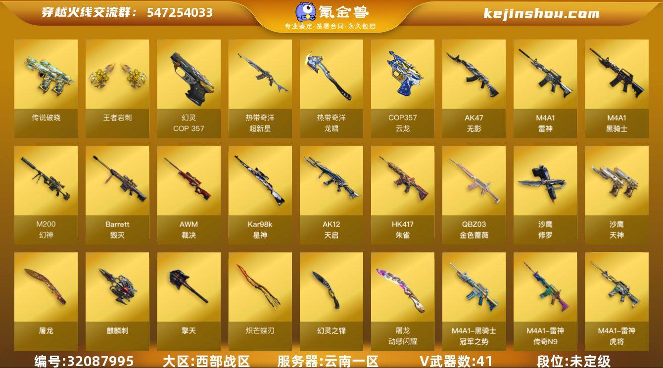 云南一区-44V-1王者武器数-0炫金武器数 【传说武器】:传说破晓 【传说角色】:传说影煞 【热门武器】:传说破晓,QBZ03-金色蔷薇,HK417-朱雀,M200-幻神,Kar98K-星神,M4A1-黑骑士,加特林-炼狱*2,羊驼玩偶,COP 357-幻灵,沙鹰-修罗*2,炽芒蝶刃 【王者炫金武器】:王者岩刺 【音效卡】:M200-幻神音效卡,M4A1-黑骑士音效卡,Barrett-毁灭音效卡,M4A1-苍鸣雷神音效卡,AWM-昌龙-怀旧音效卡 【皮肤】:幻神-宠儿-2021MVP,裁决-巅峰荣耀 皮肤,星神-破竹皮肤,雷神-虎将,雷神-传奇N9,毁灭-荣耀之怒,毁灭-AG-CFPLS15冠军,黑骑士-冠军之势,AK47-黑武士-361,AWM-天龙-传奇白鲨,修罗-冠军之魂,屠龙-荣耀之锋,屠龙-星火燎原,龙啸-巅峰荣耀 皮肤 【角色】:樱,晴雅,战地猎狐,王者-迷迭香,奇洋探员,乔伊教练,修道士,云海玲珑,葵-阿尔法武装,飞虎队-X,嘉年华灵狐,娟娟,灵狐者-X,蜀雪,兔囡囡 【人偶武器】:迷你波特博士,迷你火种 【暴走生化】:超级对讲机 【英雄级武器】:M4A1-雷神*2,M4A1-黑骑士,AK47-无影,AK12-天启,HK417-朱雀,超新星-热带奇洋,QBZ03-金色蔷薇,机械迷城-穹宇,Barrett-毁灭*2,AWM-裁决,M200-幻神,Kar98K-星神,加特林-炼狱*2,沙鹰-修罗*2,沙鹰-天神*2,COP 357-幻灵,COP 357-云龙,屠龙*2,擎天,麒麟刺,幻灵之锋,炽芒蝶刃,龙啸-热带奇洋,高爆手雷-幻灵*4,高爆手雷-云龙,闪光弹-幻灵*3,烟雾弹-幻灵*3 【道具】:BS战队炫彩背包,CFS限定背包,Q9战队炫彩背包,WE炫彩背包,云山科技背包,奇洋探员-海龟背包,战舰背包,热带奇洋炫彩背包,超级背包,黄金超能特工背包,黑桃战神背包,女皇终结者-魔龙之吻,救世主-黑桃战神,绿色巨人,灵魂忍者,迷雾幽灵,生化弹匣,夺命之镰,防化服*3,金色流光-枪王排位*2,星辰流光-枪王排位,巅峰赛先锋-...