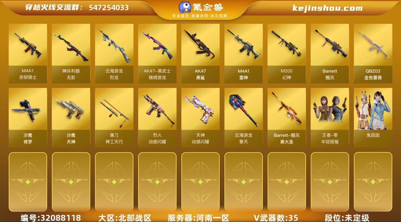 河南一区-37V-0王者-0炫金 【热门武器】:QBZ03-金色蔷薇,M200-幻神,Cat-刀锋,牛牛-AK47,沙鹰-修罗 【音效卡】:擎天-云海游龙音效卡,QBZ03-天罚音效卡,Barrett-碧霄极光音效卡,炼狱-百战金芒-庆典舞曲音效卡 【皮肤】:幻神-电竞之星 皮肤,金色蔷薇-电竞之星 皮肤,雷神-宇航兔皮肤,雷神-云海游龙皮肤,M4A1-再燃火线,毁灭-黑大圣皮肤,毁灭-秦师 皮肤,毁灭-英雄计划 皮肤,屠龙-春桃 皮肤,轻型军用手斧-再燃火线 【角色】:王者零-华冠丽服,乔伊教练,云海玲珑,初恋灵狐,飞虎队-X,嘉年华灵狐,娟娟,兰-海滩派对,兰-新年限定,猎狐者-追月,麻雀,曼陀罗-X,萌儿,潘多拉-X,潘多拉-甜心教官,斯沃特-X,蜀雪,兔囡囡,雪莉杨-摸金校尉 【人偶武器】:火麒麟-灵狐,AWM-灵狐-15周年嘉年华*2,Cat-刀锋,牛牛-AK47,迷你深渊冰龙,迷你裂空之翼,迷你牛魔王,迷你波特博士,迷你曼提柯尔,夺魂,迷你火种,生化手雷-机甲核心*3,深渊终结者手雷*2,迷你巨石泰坦-魔花研究所,灵狐娃娃手雷 【暴走生化】:超级对讲机 【挑战大师】:神圣爆裂者III,冰龙粉碎者-白马银枪,激光毁灭者III-白马银枪*2,VEPR-12-金魔,激光毁灭者III,机甲撕裂者III,试炼破坏者III,神圣爆裂者-末日III,阐释者III*2,惩戒者III 【英雄级武器】:M4A1-雷神,AK47-黑鲨,QBZ03-天罚,无影-神兵利器,黑武士-锦绣游龙,FAMAS G2-天戎,QBZ03-金色蔷薇,烈火-动感闪耀,Barrett-毁灭,M200-幻神,炼狱-百战金芒,烈龙-云海游龙,沙鹰-修罗,沙鹰-天神,天神-动感闪耀,唐刀-神工天巧,屠龙-动感闪耀,擎天-云海游龙,麒麟刺-百战金芒,高爆手雷-幻灵,高爆手雷-神工天巧,手雷-动感闪耀,手雷-云海游龙,闪光弹-神工天巧,烟雾弹-幻灵,烟雾弹-神工天巧,M4A1-赤狱骑士,M4A1-苍鸣雷神,Barrett-碧霄极光 【道具】:BS...