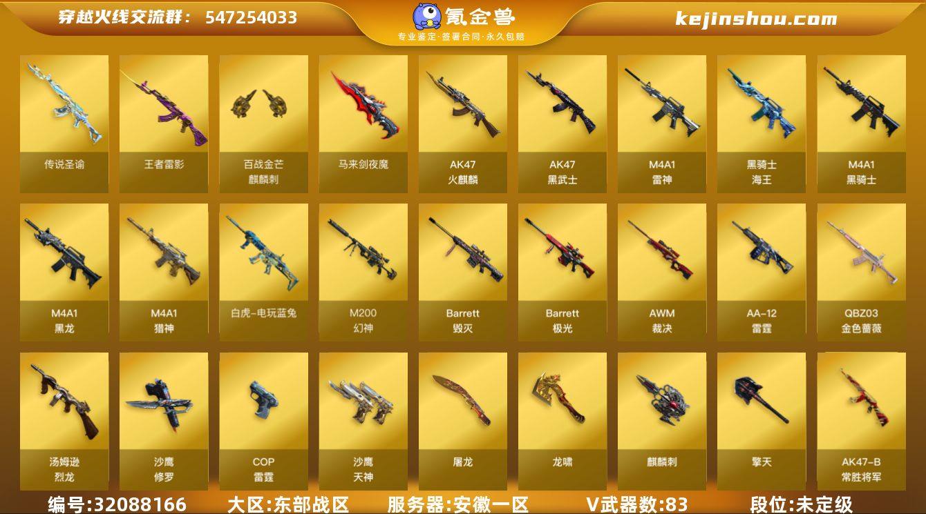 安徽一区-90V-9王者-0炫金 【传说武器】:传说圣谕 【传说角色】:传说星骇 【热门武器】:传说圣谕,QBZ03-金色蔷薇,M200-幻神,死亡之眼,白虎-电玩蓝兔,柯尔特-冠军之特,毒蜂,M4A1-黑骑士,汤姆逊-烈龙*6,加特林-炼狱,COP-白鲨,沙鹰-修罗*2 【王者炫金武器】:王者雷影,王者之魄高爆手雷,王者之魄闪光弹*2 【音效卡】:AWM-裁决音效卡,QBZ03-天罚音效卡,Barrett-碧霄极光音效卡,炼狱-百战金芒-庆典舞曲音效卡,死神-雪域霜狐-怀旧音效卡,AK47-火麒麟-怀旧音效卡 【皮肤】:幻神-丹凤,幻神-电流骇客 皮肤,幻神-荣耀世冠EP 皮肤,QBZ03-冠军之薇,裁决-运输船 皮肤,星神-璀璨皮肤,雷神-暗月,雷神-源计划2.0专属 皮肤,M4A1-再燃火线,火麒麟-平天大圣,火麒麟-心动糖果,毁灭-冠军之怒,黑骑士-暗月,天罚-课桌奇兵 皮肤,战神-粉色甜心皮肤*2,战神-紫绶金章皮肤,战神-流金岁月皮肤,AK47-B-常胜将军-刘备*3,极光-高能霹雳 皮肤,炼狱-玩具枪皮肤,修罗-百战金芒 皮肤,屠龙-荣耀世冠AG,屠龙-星火燎原,屠龙-春桃 皮肤,屠龙-惊鸿 皮肤,轻型军用手斧-再燃火线 【角色】:魅影,雨棠,机械姬,隐,妮妮,王者-瞳-闭月羞花,王者-魅影,王者玲珑-小乔,王者潘多拉,雪域霜狐,乔伊教练,云海玲珑,炽天使,暗夜-X,初恋灵狐,风暴女,疾风,娟娟,卡塔琳娜,兰妹妹,零-水下丽影,灵狐-花神,灵狐者-黄金海岸,龙儿,龙儿-小淘气,麻雀,曼陀罗-X,玫瑰花神,潘多拉-甜心教官,潜龙队-X,青霞仙子,蛇姬,斯沃特-X,铁骑荣耀,雪莉杨,影武者-X,智影 【人偶武器】:COP-白鲨,火麒麟-灵狐,迷你救赎猎手,异变清道夫-蛇影双骄,AWM-灵狐-15周年嘉年华,M37-葵,迷你深渊冰龙,夺魂,迷你牛牛,迷你生化手雷*2,生化手雷-机甲核心*3,深渊终结者手雷*2,闪光弹-小乔,闪光弹-貂蝉,高爆手雷...