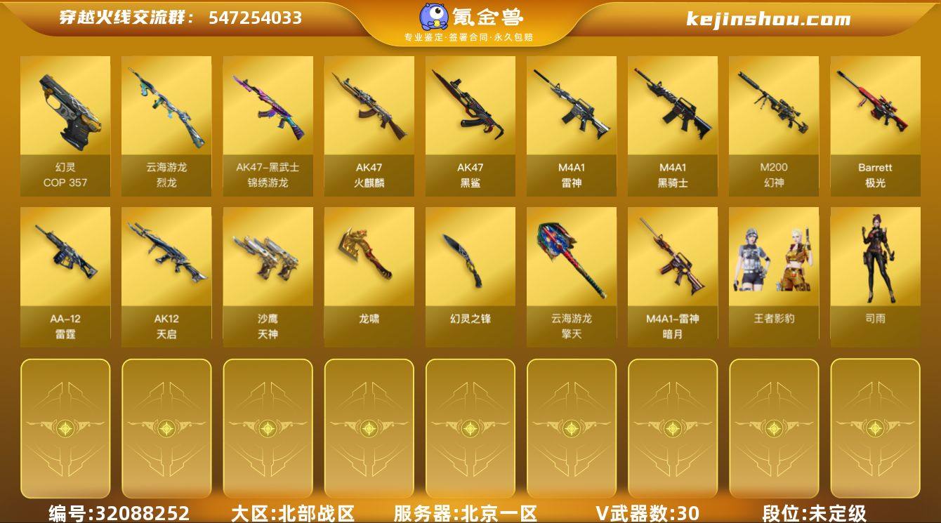 北京一区-36V-3王者武器数-0炫金武器数 【热门武器】:M200-幻神,凤吟之魄,QBZ03-街机,牛牛-AK47,M4A1-黑骑士,COP 357-幻灵 【王者炫金武器】:凤吟之魄,王者玉锋 【音效卡】:Barrett-极光音效卡 【皮肤】:幻神-冠军之幻,幻神-AG-CFPL S24冠军 皮肤,幻神-电竞之星 皮肤,雷神-暗月,雷神-源计划2.0专属 皮肤,龙啸-巅峰荣耀 皮肤 【角色】:司雨,王者影豹,蛇隐宗,乔伊教练,云海玲珑,电竞少女,猎狐者-追月,灵狐者-X,灵狐者-七夕宝贝,流浪蔷薇,龙儿-小淘气,曼陀罗-X,潘多拉-甜心教官,蛇姬,兔囡囡,新娜塔莎,影武者-X 【人偶武器】:Scar Light-马枪,牛牛-AK47,迷你牛牛,迷你生化手雷,深渊终结者手雷,AK12-烈火-灵狐者,灵狐娃娃手雷 【暴走生化】:双面神 【挑战大师】:冰龙粉碎者-白马银枪*2,机甲撕裂者III,KAC-圣炎切割者III 【英雄级武器】:AK47-火麒麟,M4A1-雷神,M4A1-黑骑士,AK12-天启,AK47-黑鲨,黑武士-锦绣游龙,王者风势-觉醒版,Barrett-极光,M200-幻神,烈龙-云海游龙,AA-12-雷霆,沙鹰-天神,COP 357-幻灵,龙啸*2,幻灵之锋,擎天-云海游龙,高爆手雷-幻灵,高爆手雷-竞技荣光*2,手雷-云海游龙,高爆手雷-古蛇迷踪,闪光弹-幻灵*2,闪光弹-竞技荣光,烟雾弹-幻灵*2,烟雾弹-竞技荣光,烟雾弹-古蛇迷踪 【道具】:云海游龙炫彩背包,冰冰企鹅背包,古蛇迷踪炫彩背包,背包-洛丽塔,绿色巨人,灵魂忍者,迷雾幽灵,夺命之镰*2,防化服*2,金色流光-枪王排位,星辰流光-枪王排位,枪王排位28赛季金色流光,枪王排位29赛季金色流光,古蛇迷踪打击特效,蛇隐宗表情,云海游龙表情,C4-黑曜,防弹头盔*2,防弹衣*2,C4工具钳*2,手雷包*2 【特殊枪械】:1黑骑士