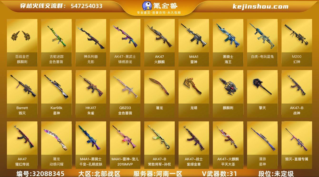 河南一区-33V-21王者武器数-0炫金武器数 【热门武器】:QBZ03-金色蔷薇,HK417-朱雀,M200-幻神,金色蔷薇-古蛇迷踪,修罗-古蛇迷踪,死亡之眼,白虎-电玩蓝兔,Kar98K-星神 【音效卡】:火线妹语音包 【皮肤】:幻神-荣耀世冠EP 皮肤,白虎-AG-CFPLS20冠军,QBZ03-荣耀世冠EP 皮肤,星神-漫游,雷神-荣耀之魄,雷神-宠儿-2019MVP,火麒麟-平天大圣,火麒麟-心动糖果,毁灭-SV-CFPLS16冠军,毁灭-BEAN-2020MVP,毁灭-黑大圣皮肤,毁灭-直播专属,M4A1-千变-孔明皮肤,战神-紫绶金章皮肤,AK47-B-常胜将军-孙权,天神-暗月,龙啸-冠军之啸,擎天-秘银,麒麟刺-甜蜜糖果 皮肤 【角色】:电竞教官-云悠悠,战地猎狐,王者凌霄,蛇隐宗,乔伊教练,暗夜-X,初恋灵狐,芳心审判者,风暴女,嘉年华灵狐,娟娟,灵狐者-七夕宝贝,龙儿-小淘气,曼陀罗-礼服,女主播,潘多拉-X,潘多拉-甜心教官,邱刚敖,蛇姬,斯沃特-X,兔囡囡,樱-战斗天使,职业选手 【人偶武器】:天龙-曼陀罗,AWM-灵狐-15周年嘉年华,迷你深渊冰龙,迷你裂空之翼,迷你牛魔王,夺魂,迷你牛牛,深渊终结者手雷,迷你深渊冰龙-王绿豆,迷你超能女侍 【暴走生化】:黑龙吞噬者,死亡之眼,超级对讲机 【挑战大师】:神圣爆裂者III,冰龙粉碎者-白马银枪,激光毁灭者III,试炼破坏者III,神圣爆裂者-末日III*3 【英雄级武器】:AK47-火麒麟,M4A1-雷神,HK417-朱雀,QBZ03-天罚,无影-神兵利器,黑武士-锦绣游龙,金色蔷薇-古蛇迷踪,QBZ03-金色蔷薇,AK-47-猩红传说,AK47-B-战神,黑骑士-海王,白虎-电玩蓝兔,Barrett-毁灭,M200-幻神,Kar98K-星神,王者之光-觉醒版,柯尔特-荣耀世冠EP,天神-动感闪耀,修罗-古蛇迷踪,屠龙,龙啸,擎天,麒麟刺*2,高爆手雷-幻灵,手雷-动感闪耀,高爆手雷-古蛇迷踪,闪光弹-幻灵,烟雾弹-幻灵,烟雾弹-古蛇迷踪...