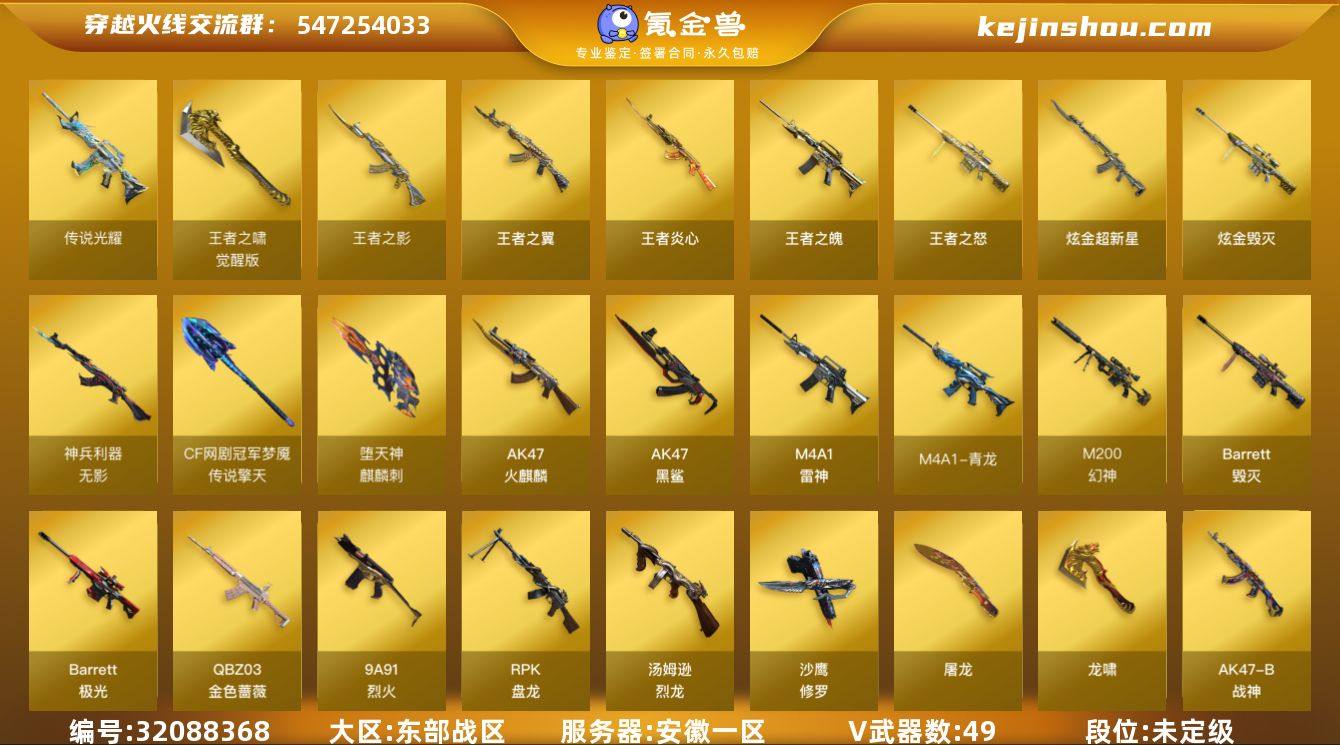 安徽一区-56V-12王者武器数-2炫金武器数 【传说武器】:传说光耀 【热门武器】:传说光耀,QBZ03-金色蔷薇,M4A1-青龙,M200-幻神,死亡之眼,王者炎心,汤姆逊-烈龙*6,RPK-盘龙,沙鹰-修罗*4 【王者炫金武器】:王者炎心,王者之翼,王者之影,王者之魄*2,王者之怒*2,炫金超新星,炫金毁灭 【音效卡】:Barrett-毁灭音效卡 【皮肤】:M200-幻神-黄忠皮肤,幻神-动感闪耀 皮肤,雷神-星空,火麒麟-心动糖果,毁灭耀金皮肤,毁灭-星空,毁灭-战神张飞,无影-能量核心,战神-粉色甜心皮肤*4,战神-紫绶金章皮肤*2,战神-流金岁月皮肤*4,极光-能量核心,修罗-能量核心 【角色】:葵,樱,王者-瞳-闭月羞花,王者炽天使,乔伊教练,暗夜-X,风暴女*2,嘉年华灵狐,灵狐者-X,麻雀,潘多拉-X,潜龙队-X,青霞仙子,斯沃特-X,铁骑荣耀,雪莉杨,影武者-X 【人偶武器】:火麒麟-灵狐,M4A1-雷神-精英刀锋,AWM-灵狐-15周年嘉年华,海滩汪汪-巴雷特,COP-旗袍,迷你牛魔王,迷你波特博士,夺魂,迷你牛牛,生化手雷-机甲核心*2,深渊终结者手雷,闪光弹-小乔,迷你巨石泰坦-魔花研究所 【暴走生化】:死亡之眼,超级对讲机 【挑战大师】:冰龙粉碎者-白马银枪,激光毁灭者III-白马银枪*3 【英雄级武器】:AK47-火麒麟*3,M4A1-雷神,AK47-黑鲨,M4A1-青龙,无影-神兵利器,QBZ03-金色蔷薇,9A91-烈火,烈火-动感闪耀,王者之魄-觉醒版,AK-47-猩红传说*7,AK47-B-战神,黑武士-CF网剧冠军,Barrett-毁灭*4,Barrett-极光,M200-幻神,RPK-盘龙,汤姆逊-烈龙*6,沙鹰-修罗*4,天神-动感闪耀,屠龙,龙啸,麒麟刺-堕天神,屠龙-动感闪耀,擎天-CF网剧冠军,王者之锋-觉醒版,王者之啸-觉醒版*3,高爆手雷-堕天神,手雷-动感闪耀,闪光弹-堕天神,烟雾弹-堕天神 【道具】:全能枪王背包,战舰背包,超级背包,妩媚妖姬,...