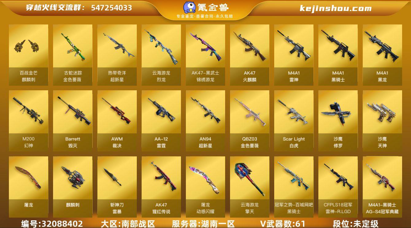 湖南一区-62V-5王者武器数-0炫金武器数 【传说角色】:传说影煞 【热门武器】:QBZ03-金色蔷薇,M14EBR-玄武,Scar Light-白虎,M200-幻神,柯尔特-荣耀世冠白鲨2023,金色蔷薇-古蛇迷踪,修罗-古蛇迷踪,M4A1-黑骑士,毁灭-孙三炮*2,COP-白鲨,沙鹰-修罗 【音效卡】:炼狱-百战金芒-庆典舞曲音效卡 【皮肤】:幻神-宠儿-2021MVP,M200-幻神-N9-2022MVP,QBZ03-巅峰荣耀皮肤,裁决-流光秘银,星神-破竹皮肤,雷神-R.LGD-CFPLS18冠军,雷神-CFS十周年纪念版 皮肤,M4A1-再燃火线,火麒麟-百城,毁灭-SV-CFPLS16冠军,毁灭-百城浙江 皮肤,黑龙-墨子皮肤,黑骑士-冠军之势,黑骑士-AG-S4冠军典藏,屠龙-荣耀之锋,屠龙-QQ会员,屠龙-春桃 皮肤,龙啸-纸灯龙皮肤,轻型军用手斧-再燃火线,麒麟刺-萌杀皮肤,麒麟刺-荣耀世冠白鲨 【角色】:审判者,王者影豹,蛇隐宗,奇洋探员,云海玲珑,暗夜-X,嘉年华灵狐,0号玩家,灵动武士,灵狐者-X,龙儿-小淘气,麻雀,曼陀罗-X,潘多拉-X,蛇姬,斯沃特-X,铁骑荣耀 【人偶武器】:COP-白鲨,毁灭-孙三炮*2,AWM-灵狐-15周年嘉年华 【英雄级武器】:AK47-火麒麟,M4A1-黑龙,M4A1-雷神,M4A1-黑骑士,AN94-超新星,Scar Light-白虎,M14EBR-玄武,黑武士-锦绣游龙,超新星-热带奇洋,金色蔷薇-古蛇迷踪,QBZ03-金色蔷薇,AK-47-猩红传说,Barrett-毁灭,AWM-裁决,M200-幻神,炼狱-百战金芒,烈龙-云海游龙,AA-12-雷霆,沙鹰-修罗,沙鹰-天神*3,柯尔特-荣耀世冠白鲨2023,修罗-古蛇迷踪,屠龙*3,麒麟刺,擎天-云海游龙,龙啸-热带奇洋,斩神刀-雷暴,麒麟刺-百战金芒,高爆手雷-雷暴*2,高爆手雷-幻灵*2,高爆手雷-竞技荣光,高爆手雷-云龙*2,手雷-云海游龙,手雷-热带奇洋,高爆手雷-古蛇迷踪,闪光弹-雷霆,闪光弹-雷暴,闪光弹-幻灵,闪光弹-竞技