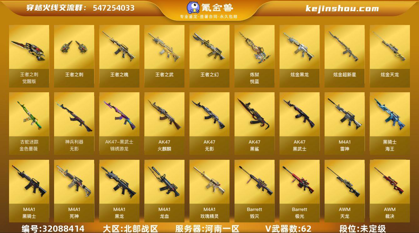 河南一区-69V-7王者武器数-4炫金武器数 【热门武器】:QBZ03-金色蔷薇,HK417-朱雀,金色蔷薇-古蛇迷踪,修罗-古蛇迷踪,死亡之眼,M4A1-黑骑士,汤姆逊-烈龙*6,RPK-盘龙*5,加特林-炼狱,斯泰尔-蝴蝶,沙鹰-修罗 【王者炫金武器】:王者之幻,王者之武,王者之魄,炼狱-悦蓝,王者之刺,炫金黑龙,炫金超新星*2,炫金天龙 【音效卡】:M4A1-雷神音效卡,M4A1-黑骑士音效卡,Barrett-毁灭音效卡,AWM-昌龙-怀旧音效卡 【皮肤】:AWM-裁决-百城联赛天津皮肤,裁决-羽掣 皮肤,雷神-暗月,雷神-星空,雷神-维纳斯皮肤,雷神-高能霹雳 皮肤,雷神-源计划2.0专属 皮肤,雷神-化蛇 皮肤,雷神-神秘按键 皮肤,火麒麟-心动糖果,毁灭-暗月,毁灭耀金皮肤,毁灭-百城浙江 皮肤,毁灭-虹光风暴 皮肤,毁灭-英雄计划 皮肤,M4A1-千变-孔明皮肤,黑龙-能量核心,黑龙-暗月,黑骑士耀金皮肤,无影-暗月,无影-能量核心,无影耀金皮肤,死神-秘银,玫瑰精灵-蓝调梦幻 皮肤,天龙-秘银 【角色】:葵,樱,战地猎狐,王者春,狐影,蛇隐宗,乔伊教练,空,初恋灵狐,电竞少女,芳心审判者,飞虎队-X,风暴女,嘉年华灵狐,荆棘玫瑰,娟娟,兰-海滩派对,兰-新年限定,0号玩家,零-水下丽影,灵狐者-七夕宝贝,麻雀,潘多拉-X,邱刚敖,蛇姬,斯沃特-X,兔囡囡,维纳斯,夜玫瑰-宠粉,影武者-X 【人偶武器】:M4A1-雷神-精英刀锋,斯泰尔-蝴蝶,AWM-灵狐-15周年嘉年华*2,COP-旗袍,迷你牛魔王,迷你波特博士,夺魂,迷你生化手雷,生化手雷-机甲核心*3,深渊终结者手雷,Barrett-夜玫瑰,迷你艾比 【暴走生化】:死亡之眼,超级对讲机 【挑战大师】:冰龙粉碎者-白马银枪,激光毁灭者III-白马银枪,激光毁灭者III,神圣爆裂者-末日III*2,阐释者III*2 【英雄级武器】:AK47-火麒麟*3,M4A1-黑龙,M4A1-雷神*2,M4A1-黑骑士,AK4...