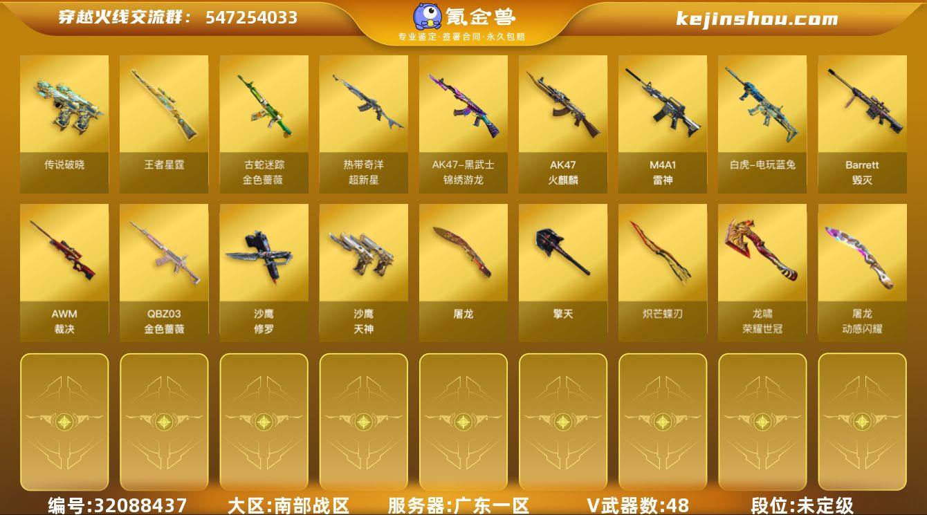 广东一区-46V-2王者武器数-0炫金武器数 【传说武器】:传说破晓 【传说角色】:传说星骇 【热门武器】:传说破晓,QBZ03-金色蔷薇,金色蔷薇-古蛇迷踪,修罗-古蛇迷踪,白虎-电玩蓝兔,沙鹰-修罗,炽芒蝶刃*2,荣耀世冠-龙啸 【王者炫金武器】:王者星霆 【音效卡】:AWM-裁决音效卡,炼狱-百战金芒-庆典舞曲音效卡,死神-雪域霜狐-怀旧音效卡 【皮肤】:裁决-运输船 皮肤,雷神-化蛇 皮肤,M4A1-再燃火线,毁灭-虹光风暴 皮肤,毁灭-英雄计划 皮肤,超新星-兔兔战士 皮肤,屠龙-星火燎原,屠龙-惊鸿 皮肤,轻型军用手斧-再燃火线 【角色】:零·纪元,雪域霜狐,蛇隐宗,奇洋探员,葵-阿尔法武装,暗夜-X,北极狐-X,初恋灵狐,飞虎队-X,风暴女,疾风,兰妹妹,猎狐者-追月,0号玩家,龙儿-小淘气,麻雀,曼陀罗-X,玫瑰花神,娜塔莉娅,潘多拉-X,潘多拉-甜心教官,青霞仙子,蛇姬,铁骑荣耀,兔囡囡,维纳斯,夜玫瑰-宠粉,游珑儿,智影 【挑战大师】:AK47-冰龙粉碎者,激光毁灭者III-白马银枪 【英雄级武器】:AK47-火麒麟,M4A1-雷神,黑武士-锦绣游龙,超新星-热带奇洋,金色蔷薇-古蛇迷踪,死神-雪域霜狐,QBZ03-金色蔷薇,王者之魄-觉醒版,白虎-电玩蓝兔,机械迷城-穹宇,Barrett-毁灭,AWM-裁决,Barrett-金色蔷薇,炼狱-百战金芒,沙鹰-修罗,沙鹰-天神,修罗-古蛇迷踪,屠龙,擎天,炽芒蝶刃*2,龙啸-热带奇洋,荣耀世冠-龙啸,麒麟刺-百战金芒,丛林匕首-玄豹*2,手雷-热带奇洋,高爆手雷-古蛇迷踪,高爆手雷-玄豹*4,闪光弹-玄豹*6,烟雾弹-古蛇迷踪,烟雾弹-玄豹*4,M4A1-赤狱骑士,Barrett-碧霄极光 【道具】:BS战队炫彩背包,云山科技背包,古蛇迷踪炫彩背包,奇洋探员-海龟背包,热带奇洋炫彩背包,百战金芒炫彩背包,超级背包,雪域霜狐炫彩背包,女皇终结者-魔龙之吻,救世主-黑桃战神,黄...
