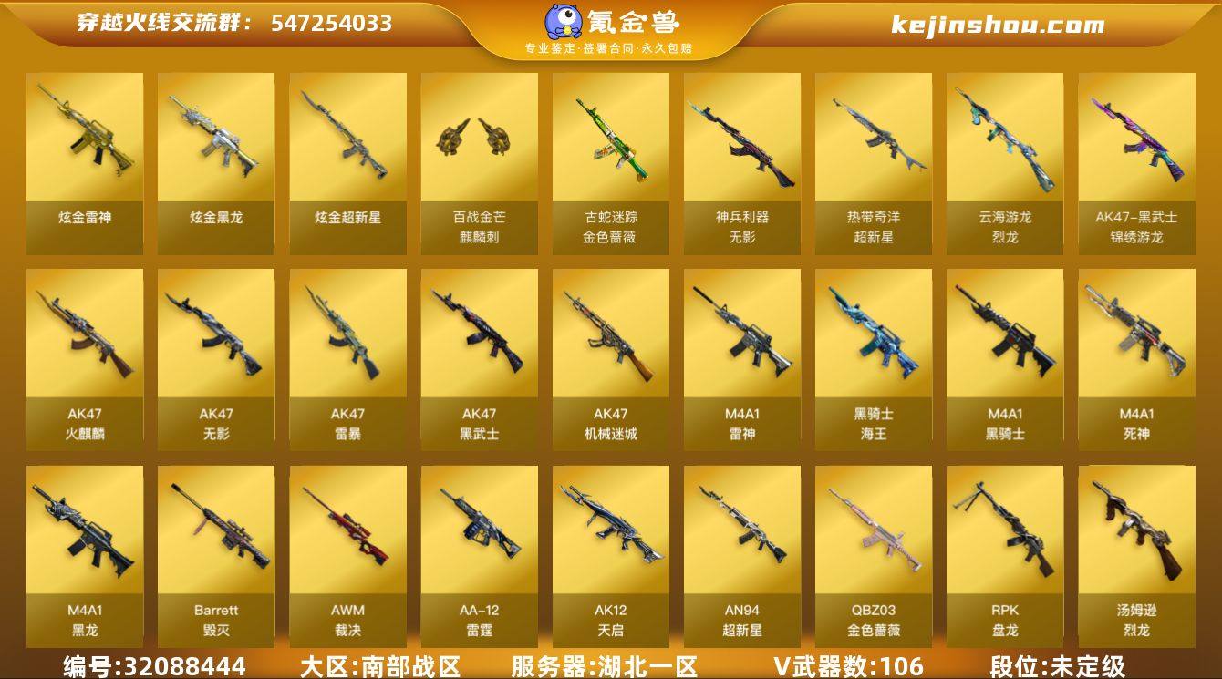 湖北一区-112V-7王者-3炫金 【传说角色】:传说星骇 【热门武器】:QBZ03-金色蔷薇,金色蔷薇-古蛇迷踪,修罗-古蛇迷踪,M200-竞技荣光,死亡之眼,M4A1-黑骑士*2,汤姆逊-烈龙*5,RPK-盘龙*3,加特林-炼狱,斯泰尔-蝴蝶,USP-雷暴*2,沙鹰-修罗*5 【王者炫金武器】:王者青龙,炫金黑龙,炫金雷神,炫金超新星 【音效卡】:M4A1-黑骑士音效卡,Barrett-毁灭音效卡,AWM-裁决音效卡,炼狱-百战金芒-庆典舞曲音效卡,死神-雪域霜狐-怀旧音效卡 【皮肤】:幻神-电竞之星 皮肤,金色蔷薇-电竞之星 皮肤,裁决-流光秘银,AWM-裁决-凤灵皮肤,裁决-羽掣 皮肤,雷神-暗月,雷神-能量核心*2,雷神-星空,雷神-宇航兔皮肤,雷神-维纳斯皮肤,雷神-源计划2.0专属 皮肤,雷神-诺拉 皮肤,M4A1-再燃火线,雷神-神秘按键 皮肤,火麒麟-AG战队皮肤,火麒麟-斗鱼平台皮肤,火麒麟-百城*2,火麒麟-心动糖果,毁灭-暗月,毁灭-星空,毁灭-黑大圣皮肤,毁灭-虹光风暴 皮肤,毁灭-英雄计划 皮肤,M4A1-千变-孔明皮肤*2,黑龙-能量核心,黑龙-暗月,M4A1-黑骑士-娜塔莉娅 皮肤,无影-能量核心,死神-秘银*2,战神-粉色甜心皮肤,战神-紫绶金章皮肤*4,战神-流金岁月皮肤*3,炼狱-玩具枪皮肤,炼狱-月 皮肤,修罗-能量核心,天神-暗月*3,天神-宇航兔皮肤,屠龙-春桃 皮肤*2,屠龙-惊鸿 皮肤,轻型军用手斧-再燃火线,龙啸-青青莓果 皮肤,麒麟刺-萌杀皮肤,麒麟刺-月皮肤 【角色】:葵,樱,电竞教官-云悠悠,战地猎狐,王者春,王者影豹,雪域霜狐,蛇隐宗,奇洋探员,乔伊教练,修道士,云海玲珑,空,北极狐-X,初恋灵狐,芳心审判者,飞虎队-X,风暴女,虎妞,嘉年华灵狐,兰-海滩派对,兰-新年限定,猎狐者-追月,零-水下丽影,灵狐-花神,灵狐者-黄金海岸,灵狐者-七夕宝贝,龙儿,龙儿-小淘气,麻雀,曼陀罗-礼服,玫瑰花神,...