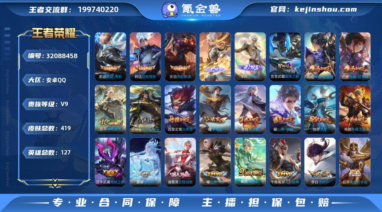 贵族等级:V9 典藏皮肤数:3 珍品无双皮肤数:0 无双皮肤数:2 珍品传说皮肤数:0 传说皮肤数:23 史诗皮肤数:128 皮肤数:419 英雄数:127 段位:荣耀王者