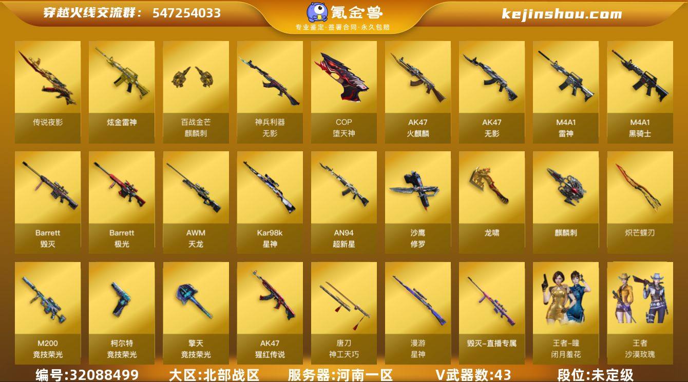 河南一区-44V-5王者-1炫金 【传说武器】:传说夜影 【热门武器】:传说夜影,M200-竞技荣光,Kar98K-星神,毒蜂,M4A1-黑骑士,COP-堕天神,沙鹰-修罗,炽芒蝶刃,金刚伞 【王者炫金武器】:炫金雷神 【音效卡】:Scar Light-白虎音效卡,Barrett-碧霄极光音效卡 【皮肤】:星神-漫游,雷神-荣耀之魄,毁灭-直播专属,麒麟刺-甜蜜糖果 皮肤 【角色】:电竞教官-云悠悠,王者-瞳-闭月羞花,王者沙漠玫瑰,乔伊教练,修道士,云海玲珑,北极狐-X,初恋灵狐,芳心审判者,风暴女*2,嘉年华灵狐,葵-赛博朋克,灵狐者-X,龙儿,龙儿-小淘气,麻雀,女主播,潘多拉-甜心教官,斯沃特-X,蜀雪,铁骑荣耀,兔囡囡,雪莉杨-摸金校尉 【人偶武器】:加特林-机械猎手,AWM-灵狐-15周年嘉年华*2,夺魂,迷你牛牛,迷你生化手雷,迷你艾比 【暴走生化】:毒蜂,黑龙吞噬者,超级对讲机 【挑战大师】:冰龙粉碎者-白马银枪,激光毁灭者III-白马银枪,激光毁灭者III,试炼破坏者III,神圣爆裂者-末日III 【英雄级武器】:AK47-火麒麟,M4A1-雷神,M4A1-黑骑士,AK47-无影,AN94-超新星,无影-神兵利器,QBZ03-独角-III,王者之魄-觉醒版,AK-47-猩红传说,王者风势-觉醒版,白虎之魄-觉醒版,AWM-天龙,Barrett-毁灭,Barrett-极光,Kar98K-星神,M200-竞技荣光,沙鹰-修罗,COP-堕天神,柯尔特-竞技荣光,王者之魂-觉醒版,龙啸,麒麟刺,擎天-竞技荣光,炽芒蝶刃,唐刀-神工天巧,高爆手雷-竞技荣光*6,闪光弹-竞技荣光*6,烟雾弹-竞技荣光*6,Barrett-碧霄极光 【道具】:云海游龙炫彩背包,亚洲杯纪念炫彩背包,全能枪王背包,女皇终结者-背包,炫彩背包,虎牙炫彩背包,超级背包,金狐背包,黄金曼提柯尔的背包,女皇终结者-魔龙之吻,绿色巨人,灵魂忍者,迷雾幽灵*2,夺命之镰,防化服*2,金色流光-枪王排位*2,星辰流光-...
