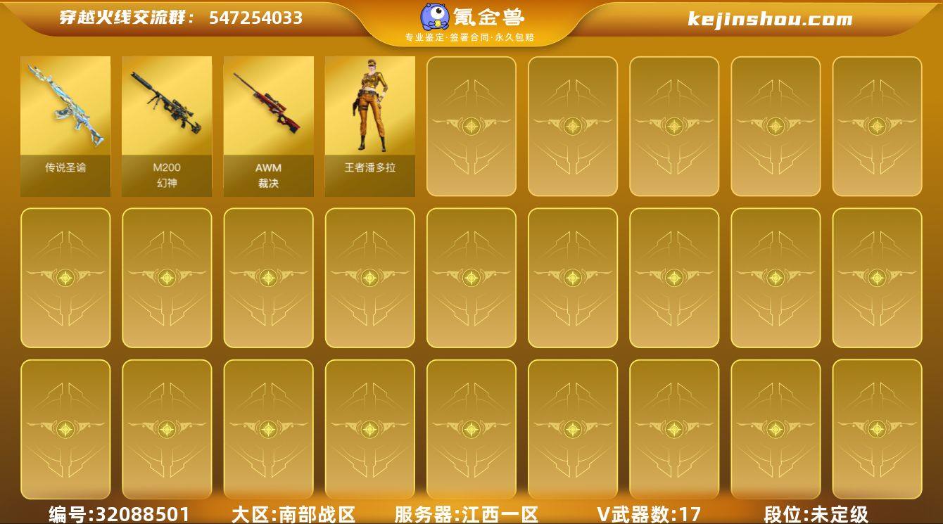 江西一区-18V-1王者武器数-0炫金武器数 【传说武器】:传说圣谕 【热门武器】:传说圣谕,M200-幻神,柯尔特-荣耀世冠白鲨2023,死亡之眼,羊驼玩偶,COP-白鲨 【音效卡】:沙鹰-修罗-盛典舞曲音效卡*2,Barrett-碧霄极光音效卡,炼狱-百战金芒-庆典舞曲音效卡 【皮肤】:M200-幻神-荣耀世冠白鲨,裁决-运输船 皮肤,M4A1-再燃火线,雷神-神秘按键 皮肤,修罗-百战金芒 皮肤,轻型军用手斧-再燃火线 【角色】:王者潘多拉,乔伊教练,修道士,暗夜-X,风暴女,兰妹妹,龙儿 【人偶武器】:COP-白鲨 【暴走生化】:死亡之眼,超级对讲机 【挑战大师】:激光毁灭者III-白马银枪 【英雄级武器】:FAMAS G2-天戎,王者猎神-觉醒版,AWM-裁决,M200-幻神,炼狱-百战金芒,柯尔特-荣耀世冠白鲨2023,麒麟刺-百战金芒,丛林匕首-玄豹,高爆手雷-玄豹,闪光弹-玄豹*2,烟雾弹-玄豹,M4A1-赤狱骑士,M4A1-苍鸣雷神,Barrett-碧霄极光 【道具】:BS战队炫彩背包,云山科技背包,亚洲杯纪念炫彩背包,女皇终结者-背包,炫彩背包-诺拉,百战金芒炫彩背包,超级背包,女皇终结者-魔龙之吻,救世主-黑桃战神,黄金生化钩,绿色巨人,灵魂忍者,妖姬,迷雾幽灵*2,夺命之镰,防化服*3,语音特效-盛典烟火,萌萌小葵表情,防弹头盔*3,防弹衣,C4工具钳*3,手雷包*3 【特殊枪械】: