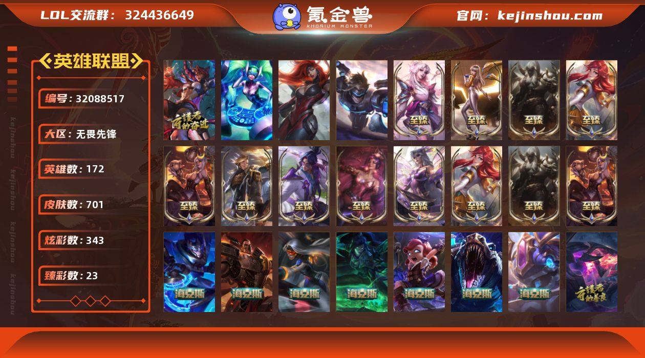 未定级段位-172英雄-701皮肤-343炫彩-4终极-25神话-131限定-72传说-158史诗 【神话皮肤】:十周年纪念安妮,源代码乐芙兰,十五周年纪念希维尔,暗星科加斯,神凰行者瑞羽圣凰艾尼维亚,海克斯科技安妮,海克斯科技嘉文四世,海克斯科技克格莫,海克斯科技雷克顿,恐惧新星德莱厄斯,摄魂使者薇恩,新创战纪希维尔,至臻花仙使者卡特琳娜,至臻剪纸仙灵希维尔,至臻KDA卡莎,至臻烈焰美人薇恩,至臻烈焰美人薇恩2022,至臻灵魂莲华易,至臻灵能特工伊泽瑞尔,至臻腥红之月亚托克斯,至臻腥红之月亚托克斯2022,至臻战斗学院拉克丝,至臻战斗学院拉克丝2022 【热门头像】:战斗学院拉克丝头像 【至臻皮肤】:至臻灵魂莲华易,至臻剪纸仙灵希维尔,至臻花仙使者卡特琳娜,至臻烈焰美人薇恩,至臻烈焰美人薇恩(2022),至臻灵能特工伊泽瑞尔,至臻战斗学院拉克丝,至臻战斗学院拉克丝(2022),至臻灵魂莲华拉克丝,至臻永恒星灵佐伊,至臻KDA卡莎,至臻腥红之月亚托克斯,至臻腥红之月亚托克斯(2022) 【臻彩皮肤】:古琴余韵娑娜炫金天籁,天龙之子卡莎飞龙乘云,无畏骑士瑟庄妮赤子初心,冠军之箭艾希凯旋圣装,吕布奉先炫金战神,张辽文远炫金将军,墨之影武者亚索金墨耀影,征服者韦鲁斯炫金,冠军典狱长锤石凯旋圣装,冰雪游神巴德炫金,冠军之矛卡莉丝塔凯旋圣装,战斗学院凯特琳独角兽,玉剑传说无影竞星,西部魔影卢锡安贝利尔之怠,天煞劫恒星游历者,咖啡甜心金克丝核桃巴菲,星之守护者金克丝黑洞,灵魂莲华亚索霜见之时,魔女阿卡丽虚荣,净雪之月莫甘娜冬虹,幻灵战斗兔阿萝拉梦幻强袭,这货不是银狐库奇,心之钢伊泽瑞尔天纵才华 【年限皮肤】:龙的传人李青,古琴余韵娑娜,定海神珍孙悟空,碧玉之牙卡西奥佩娅,神龙之翼库奇,神龙烈焰金克丝,美猴王孙悟空,张辽文远,司马懿仲达,南天之怒沃里克,烈...