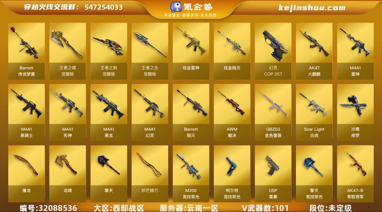 云南一区-113V-10王者武器数-3炫金武器数 【传说武器】:传说梦魇 【热门武器】:传说梦魇,QBZ03-金色蔷薇,Scar Light-白虎*2,M200-竞技荣光,金色小号,M4A1-黑骑士,加特林-炼狱,雷神-小红,USP-雷暴,COP 357-幻灵*3,沙鹰-修罗*4,炽芒蝶刃 【王者炫金武器】:王者冰锋,炫金雷神*2,炫金毁灭 【音效卡】:AK47-火麒麟音效卡,M4A1-黑骑士音效卡,Barrett-毁灭音效卡,AWM-裁决音效卡,Scar Light-白虎音效卡 【皮肤】:裁决-星际旅行 皮肤,雷神-暗月,雷神-机甲刑天皮肤,火麒麟-雷神,火麒麟-盘古,火麒麟-百城,毁灭-风暴*2,毁灭-英雄计划 皮肤,AK47-B-常胜将军-曹操*2,AK47-B-常胜将军-刘备,AK47-B-常胜将军-孙权,极光-能量核心,屠龙-春桃 皮肤,轻型军用手斧-再燃火线 【角色】:葵,影豹,电竞教官-云悠悠,王者-葵-貂蝉,王者葵-惊若翩鸿,王者春,王者玲珑-小乔,乔伊教练,修道士,葵-阿尔法武装,灵狐者-X,灵狐者-七夕宝贝,龙儿-小淘气,麻雀,潘多拉-甜心教官,斯沃特-X,铁骑荣耀,樱-战斗天使 【人偶武器】:雷神-小红,COP-旗袍,迷你深渊冰龙,迷你波特博士,生化手雷-机甲核心,闪光弹-貂蝉,高爆手雷-大乔 【暴走生化】:超级对讲机 【挑战大师】:AK47-冰龙粉碎者,冰龙粉碎者-白马银枪,试炼破坏者III,神圣爆裂者-末日III 【英雄级武器】:AK47-火麒麟*2,M4A1-黑龙*2,M4A1-雷神,M4A1-黑骑士,M4A1-死神*4,Scar Light-白虎*2,M4A1-幻灵,QBZ03-独角-III,QBZ03-金色蔷薇,王者冰魄-觉醒版,AK47-B-常胜将军,王者之烈-觉醒版,QBZ-03-王者蔷薇-觉醒版,机械迷城-穹宇,Barrett-毁灭*4,AWM-裁决*2,M200-竞技荣光,王者之怒-觉醒版,加特林-炼狱,沙鹰-修罗*4,USP-雷暴,COP 357-幻灵*3,柯尔特-竞技荣光,屠龙*2,龙啸,擎天,幻灵之锋,擎