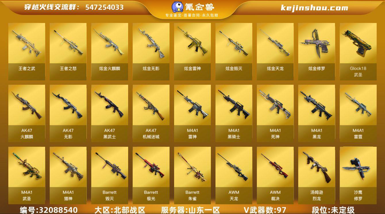 山东一区-111V-10王者武器数-7炫金武器数 【热门武器】:M200-竞技荣光,死亡之眼*5,M4A1-黑骑士,汤姆逊-烈龙*6,加特林-炼狱,USP-雷暴,沙鹰-修罗*6 【王者炫金武器】:王者之武,王者之怒,炫金火麒麟,炫金无影,炫金雷神,炫金武士,炫金毁灭,炫金天龙,炫金修罗 【音效卡】:AK47-火麒麟音效卡,M4A1-雷神音效卡,M4A1-黑骑士音效卡,Barrett-毁灭音效卡 【皮肤】:烈龙-星空,雷神-能量核心,雷神-荣耀之魄,雷神-星空*2,雷神-耀金皮肤,雷神-冠军之魄,火麒麟-雷神,火麒麟-冠军之心,毁灭-荣耀之怒,毁灭耀金皮肤,毁灭-星空*2,黑龙-能量核心,黑骑士-暗月,AK47-黑武士-361,AWM-天龙-传奇白鲨,修罗-能量核心*2,擎天-秘银*3 【角色】:葵,樱,瞳,魅影,炫,电竞教官-云悠悠,王者春,灵狐者-黄金海岸,潘多拉-X,蜀雪,影武者-X 【人偶武器】:火麒麟-灵狐,COP-旗袍 【暴走生化】:死亡之眼*5 【挑战大师】:激光毁灭者III 【英雄级武器】:AK47-火麒麟*2,M4A1-黑龙*3,M4A1-雷神*2,M4A1-黑骑士,AK47-无影*2,M4A1-死神*3,AK47-黑武士*5,M4A1-武圣,AK47-机械迷城*3,M4A1-雷霆,M4A1-猎神,王者之心-觉醒版,王者之影-觉醒版,王者之武-觉醒版,王者之魄-觉醒版,王者之势-觉醒版,AK-47-猩红传说,AWM-天龙*3,Barrett-毁灭*3,Barrett-极光,AWM-裁决*2,Barrett-朱雀,M200-竞技荣光,王者之怒-觉醒版,王者之光-觉醒版,王者之决-觉醒版,加特林-炼狱,汤姆逊-烈龙*6,沙鹰-修罗*6,沙鹰-天神,USP-雷暴,COP-雷霆,柯尔特-竞技荣光,Glock18-武圣,屠龙*7,擎天,擎天-竞技荣光,高爆手雷-雷霆*7,高爆手雷-竞技荣光*4,闪光弹-雷霆*7,闪光弹-竞技荣光*3,烟雾弹-雷霆*7,烟雾弹-竞技荣光*3 【道具】:炫彩背包,超级背包,变异宝贝,生化弹匣,夺命之镰,防化服,云海游龙表情,...