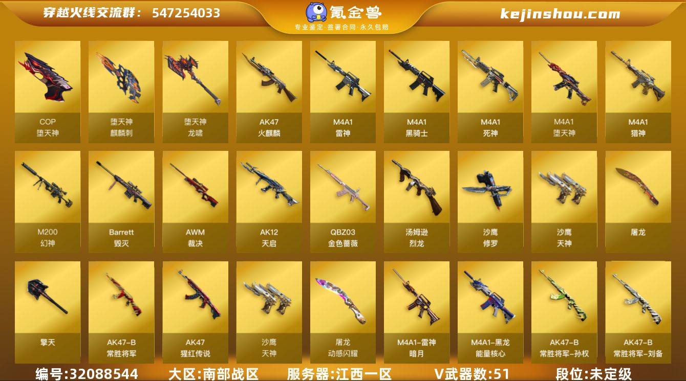 江西一区-52V-2王者-0炫金 【热门武器】:QBZ03-金色蔷薇,M200-幻神,M4A1-黑骑士,汤姆逊-烈龙*5,COP-堕天神,沙鹰-修罗*2 【音效卡】:AK47-火麒麟音效卡,M4A1-黑骑士音效卡 【皮肤】:雷神-暗月,雷神-烈虎皮肤,火麒麟-AG战队皮肤,火麒麟-平天大圣,火麒麟-百城,黑龙-能量核心,战神-流金岁月皮肤,AK47-B-常胜将军-刘备,AK47-B-常胜将军-孙权*2,修罗-能量核心 【角色】:迷迭香,虎妞,娟娟,灵狐者-七夕宝贝,灵狐者-职业经理,龙儿-小淘气,青霞仙子,蜀雪,新娜塔莎,雪莉杨-摸金校尉 【人偶武器】:巴雷特-零-水下丽影,闪光弹-貂蝉,高爆手雷-大乔,迷你艾比 【英雄级武器】:AK47-火麒麟,M4A1-雷神,M4A1-黑骑士,M4A1-死神,AK12-天启,M4A1-堕天神,QBZ03-金色蔷薇,M4A1-猎神,AK-47-猩红传说,AK47-B-常胜将军,Barrett-毁灭,AWM-裁决,M200-幻神,汤姆逊-烈龙*5,沙鹰-修罗*2,沙鹰-天神*2,COP-堕天神,屠龙,麒麟刺-堕天神*3,擎天,龙啸-堕天神,王者之啸-觉醒版,王者之击-觉醒版,高爆手雷-堕天神*5,高爆手雷-幻灵*2,闪光弹-堕天神*5,闪光弹-幻灵,烟雾弹-堕天神*5,烟雾弹-幻灵 【道具】:超级背包,黄金生化钩,迷雾幽灵,夺命之镰,防化服,EP战队名片,防弹头盔,防弹衣,C4工具钳,手雷包 【特殊枪械】:1黑骑士,5烈龙