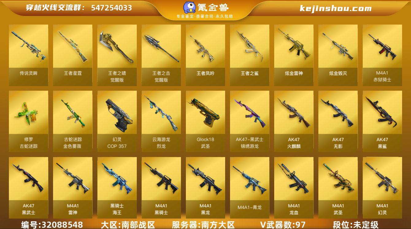 南方大区-111V-17王者武器数-4炫金武器数 【传说武器】:传说灵眸 【热门武器】:传说灵眸,G36C-幻影,QBZ03-金色蔷薇*2,M14EBR-玄武,M4A1-青龙,M200-幻神,金色蔷薇-古蛇迷踪,修罗-古蛇迷踪,白虎-电玩蓝兔,Kar98K-星神,毒蜂*2,M4A1-黑骑士,汤姆逊-烈龙*5,COP-白鲨,COP 357-幻灵*2,沙鹰-修罗*7,炽芒蝶刃*2 【王者炫金武器】:王者之鲨*2,王者凤吟,王者星霆,王者玉锋,炫金雷神,炫金武士*2,炫金毁灭 【音效卡】:屠龙-动感闪耀 音效卡,修罗-云海游龙音效卡,Barrett-极光音效卡,QBZ03-金色蔷薇音效卡,白鲨语音包,N9语音包,炼狱-百战金芒-庆典舞曲音效卡 【皮肤】:M200-幻神-荣耀世冠白鲨,幻神-动感闪耀 皮肤,幻神-电流骇客 皮肤,QBZ03-冠军之薇,QBZ03-荣耀世冠白鲨*2,QBZ03-金色蔷薇-斗鱼皮肤,裁决-流光秘银,裁决-羽掣 皮肤,裁决-运输船 皮肤,星神-璀璨皮肤,雷神-暗月,雷神-荣耀之魄,雷神-星空,雷神-传奇N9,雷神-维纳斯皮肤,雷神-源计划2.0专属 皮肤,雷神-化蛇 皮肤,雷神-诺拉 皮肤,M4A1-再燃火线,雷神-神秘按键 皮肤,传奇石头-横秒之巅,火麒麟-平天大圣,火麒麟-百城,毁灭-冠军之怒,毁灭-黑大圣皮肤,毁灭-航天科技皮肤,毁灭-英雄计划 皮肤,M4A1-黑龙-361,黑骑士耀金皮肤*2,无影耀金皮肤,无影-霓裳皮肤,黑武士-典韦皮肤,Barrett-金色蔷薇-蛇姬 皮肤,炼狱-星空,修罗-冠军之魂*3,屠龙-荣耀之锋*2,屠龙-荣耀世冠AG,屠龙-星火燎原,屠龙-春桃 皮肤,屠龙-惊鸿 皮肤,龙啸-蛇姬 皮肤,轻型军用手斧-再燃火线 【角色】:影豹,月兔特工,关小雨,王者-瞳-闭月羞花,王者-零-国色天香,王者复仇,王者涂鸦,王者影豹,王者-救世主,王者潘多拉,王者沙漠玫瑰,蛇隐宗,乔伊教练,云海玲珑,葵-阿尔法武装,暗夜-X,初恋灵狐,电竞少女,风暴女,疾风,兰-新...