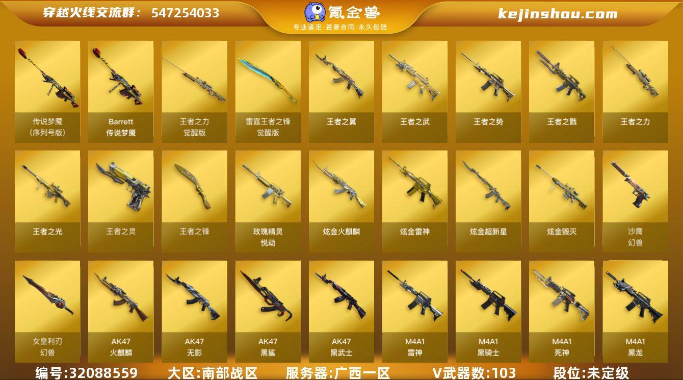 广西一区-111V-15王者武器数-7炫金武器数 【传说武器】:传说梦魇 【热门武器】:传说梦魇,QBZ03-金色蔷薇,HK417-朱雀,M4A1-青龙,M200-竞技荣光,死亡之眼*2,C.A.T,毒蜂,M4A1-黑骑士,汤姆逊-烈龙*9,RPK-盘龙*6,加特林-炼狱*4,火麒麟-绝迹,沙鹰-修罗*6,高爆手雷-幻兽 【王者炫金武器】:王者之戮,王者之翼*2,王者之势,王者之武,玫瑰精灵-悦动,王者之光*2,王者之力,王者之灵,王者之锋,炫金火麒麟,炫金骑士*2,炫金雷神*2,炫金超新星,炫金毁灭 【音效卡】:AK47-火麒麟音效卡*2,M4A1-雷神音效卡,M4A1-黑骑士音效卡,Barrett-毁灭音效卡 【皮肤】:雷神-暗月,雷神-星空,雷神-虎将,雷神-耀金皮肤,雷神-云海游龙皮肤,火麒麟-轻羽皮肤,火麒麟-心动糖果,毁灭-暗月,毁灭-星空,黑龙-能量核心,无影-能量核心,无影耀金皮肤,无影-霓裳皮肤,战神-粉色甜心皮肤,战神-紫绶金章皮肤*3,战神-流金岁月皮肤,天龙-秘银,AWM-天龙-传奇70KG,AWM-天龙-传奇白鲨,极光-能量核心,修罗-能量核心,修罗-星空 【角色】:零,樱,瞳,电竞教官-云悠悠,王者葵-惊若翩鸿,王者复仇,乔伊教练,云海玲珑,炽天使,嘉年华灵狐,斯沃特-X,樱-青春偶像 【人偶武器】:火麒麟-绝迹,天龙-曼陀罗,火麒麟-灵狐,M4A1-雷神-精英刀锋,迷你宝贝,AWM-灵狐-15周年嘉年华,C.A.T,迷你生化手雷*3 【暴走生化】:毒蜂,异变清道夫,双面神,死亡之眼*2,超级对讲机 【英雄级武器】:AK47-火麒麟*3,M4A1-黑龙*2,M4A1-雷神*3,M4A1-黑骑士,AK47-无影,M4A1-死神,AK47-黑武士*2,AK47-黑鲨,M4A1-龙血,M4A1-青龙,HK417-朱雀,M4A1-玫瑰精灵,QBZ03-金色蔷薇,烈火-动感闪耀,王者之幻-觉醒版,AK-47-猩红传说*2,AWM-天龙,Barrett-毁灭*2,Barrett-极光,AWM-裁决,Barrett-朱雀,M200-竞技