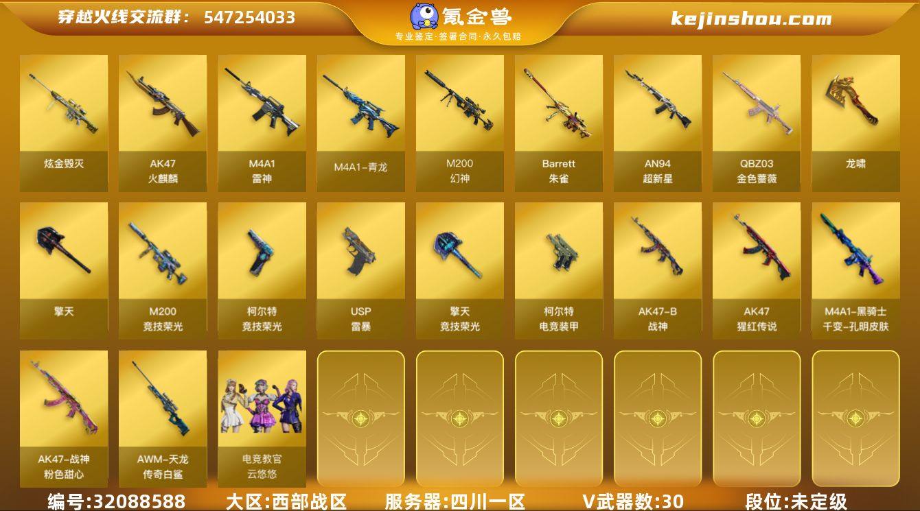 四川一区-31V-1王者-1炫金 【热门武器】:QBZ03-金色蔷薇,M4A1-青龙,M200-幻神,M200-竞技荣光,USP-雷暴,炽芒蝶刃-荣耀世冠白鲨2023 皮肤 【王者炫金武器】:炫金毁灭 【皮肤】:幻神-纸灯龙皮肤,幻神-荣耀世冠白鲨2023 皮肤,M4A1-千变-孔明皮肤,战神-粉色甜心皮肤,AWM-天龙-传奇白鲨,炽芒蝶刃-荣耀世冠白鲨2023 皮肤 【角色】:电竞教官-云悠悠,芳心审判者,娟娟,兰-新年限定,潘多拉-X,潜龙队-X,斯沃特-X,影武者-X 【人偶武器】:火麒麟-灵狐,迷你牛牛,闪光弹-小乔 【暴走生化】:超级对讲机 【挑战大师】:冰龙粉碎者-白马银枪,激光毁灭者III,神圣爆裂者-末日III 【英雄级武器】:AK47-火麒麟,M4A1-雷神,AN94-超新星,M4A1-青龙,QBZ03-金色蔷薇,AK-47-猩红传说,AK47-B-战神,王者芳薇-觉醒版,M200-幻神,Barrett-朱雀,M200-竞技荣光,USP-雷暴,柯尔特-电竞装甲,柯尔特-竞技荣光,龙啸,擎天,擎天-竞技荣光,高爆手雷-竞技荣光*2,闪光弹-竞技荣光*3,烟雾弹-幻灵,烟雾弹-竞技荣光*3 【道具】:BS战队炫彩背包,云海游龙炫彩背包,亚洲杯纪念炫彩背包,超级背包,绿色巨人,灵魂忍者,迷雾幽灵,夺命之镰,防化服*2,金色流光-枪王排位*2,EP战队名片,防弹头盔*2,防弹衣*2,C4工具钳*2,手雷包*2 【特殊枪械】: