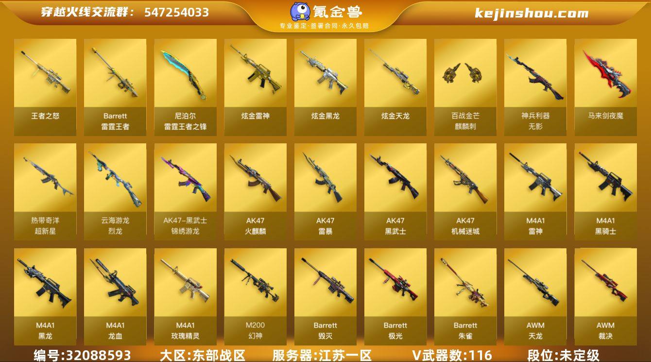 江苏一区-129V-14王者武器数-5炫金武器数 【热门武器】:QBZ03-金色蔷薇,Scar Light-白虎,M200-幻神,死亡之眼*2,M4A1-黑骑士,汤姆逊-烈龙*5,加特林-炼狱,降世魔童,USP-雷暴,沙鹰-修罗*4,炽芒蝶刃 【王者炫金武器】:王者之怒,Barrett-雷霆王者,雷霆王者之锋,炫金骑士,炫金黑龙,炫金雷神*2,炫金天龙 【音效卡】:M4A1-黑骑士音效卡,Barrett-毁灭音效卡 【皮肤】:白虎-大汉风骨,雷神-暗月,雷神-星空,雷神-维纳斯皮肤,火麒麟-雷神,火麒麟-冠军之心,毁灭耀金皮肤,毁灭-星空,毁灭-英雄计划 皮肤,黑龙-能量核心,黑龙-墨子皮肤,黑骑士-暗月,AK47-黑武士-361,战神-紫绶金章皮肤*6,战神-流金岁月皮肤,天龙-秘银*2,极光-能量核心*2,修罗-能量核心,屠龙-春桃 皮肤 【角色】:零,炫,春,审判者,王者-瞳-闭月羞花,堕落女神,奇洋探员,修道士,云海玲珑,暗夜-X,初恋灵狐,电竞少女,飞虎队-X,风暴女,嘉年华灵狐,兰-新年限定,猎狐者-追月,0号玩家,零-水下丽影,灵狐-花神,灵狐者-黄金海岸,灵狐者-职业经理,龙儿,麻雀,曼陀罗-X,曼陀罗-礼服,潘多拉-X,潘多拉-甜心教官,青霞仙子,蛇姬,蜀雪,铁骑荣耀,兔囡囡,新娜塔莎,雪莉杨,雪莉杨-摸金校尉,夜玫瑰-幻能朋克,影武者-X,游珑儿 【人偶武器】:星神-炽天使,AWM-灵狐-15周年嘉年华,COP-旗袍,迷你深渊冰龙,闪光弹-小乔,迷你超能女侍,降世魔童 【暴走生化】:死亡之眼*2,超级对讲机 【挑战大师】:神圣爆裂者III,AK47-冰龙粉碎者,激光毁灭者III-白马银枪,激光毁灭者III,阐释者III 【英雄级武器】:AK47-火麒麟,M4A1-黑龙*3,M4A1-雷神*3,M4A1-黑骑士,AK47-黑武士,AK12-天启,AK47-机械迷城,M4A1-龙血,AK47-雷暴,Scar Light-白虎,无影-神兵利器,黑武士-锦绣游龙,超新星-热带奇洋,M4A1-玫瑰精灵...