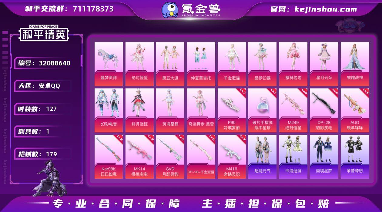 妹妹号 12粉12特1载具 安卓 手Q-12粉装-12特效枪-1载具-8粉色飞行器-62076热力值-8王牌印记-127套装-179枪皮 【热门品类】:套装-糯粉咩咩 【粉色套装】:角色-绝对恒星,粉装-第五大道,粉装-仲夏莫吉托,角色-千金淑猫,角色-晶梦幻蝶,角色-樱桃泡泡,粉装-星月云朵,角色-智耀战神,粉装-幻彩电音,角色-绯月迷踪,角色-荧海星豚,角色-奇迹舞步 美雪 【粉色枪皮等级】:AKM-暮色玫影(三级),M416-女娲灵识(三级),AUG-暖羊咩咩(五级),P90-冷漠罗丽(七级),Kar98K-巳巳如意(五级),Mk14-樱桃泡泡(五级),Mk14-福马献瑞(一级),SVD-月影灵韵(五级),M249-绝对恒星(六级),DP-28-千金淑猫(五级),DP-28-豹影疾电(五级),破片手榴弹-瓶中星球(七级) 【粉色载具】:晶梦灵驹 【粉色枪皮】:AKM-暮色玫影,M416-女娲灵识,AUG-暖羊咩咩,P90-冷漠罗丽,Kar98K-巳巳如意,Mk14-樱桃泡泡,Mk14-福马献瑞,SVD-月影灵韵,M249-绝对恒星,DP-28-千金淑猫,DP-28-豹影疾电,破片手榴弹-瓶中星球 【粉色飞行器】:绝对恒星飞行器,炫彩糖果飞行器,祥瑞起舞飞行器,镜光幻境飞行翼,时光之誓飞行器,灵猫魔法师飞行器,暮色之舞飞行器 【粉色降落伞】:绝对恒星降落伞,第五大道降落伞,千金淑猫降落伞,月影灵韵降落伞,赛博古神降落伞,晶梦幻蝶降落伞,彩虹独角兽降落伞,樱桃泡泡降落伞,雪月幻音降落伞,智耀战神降落伞,御兔特攻降落伞,幻星舰长降落伞,幻彩电音降落伞,冷漠罗丽降落伞,绯月迷踪降落伞,荧海星豚降落伞,喜羊羊与灰太狼降落伞,异瞳寒姬降落伞,炫彩糖果降落伞,虹云熊熊降落伞 【稀有套装】:套装-熊抱抱,套装-航行童话,套装-巳巳如意,套装-乐游熊熊,套装-超能元气,角色-超感刻度,角色-甜心蒙太奇,套装-雪国风尚,套装-炫彩糖果,套装-糖糖葫芦,套装-青团波波,套装-棉花软糖,角色-...