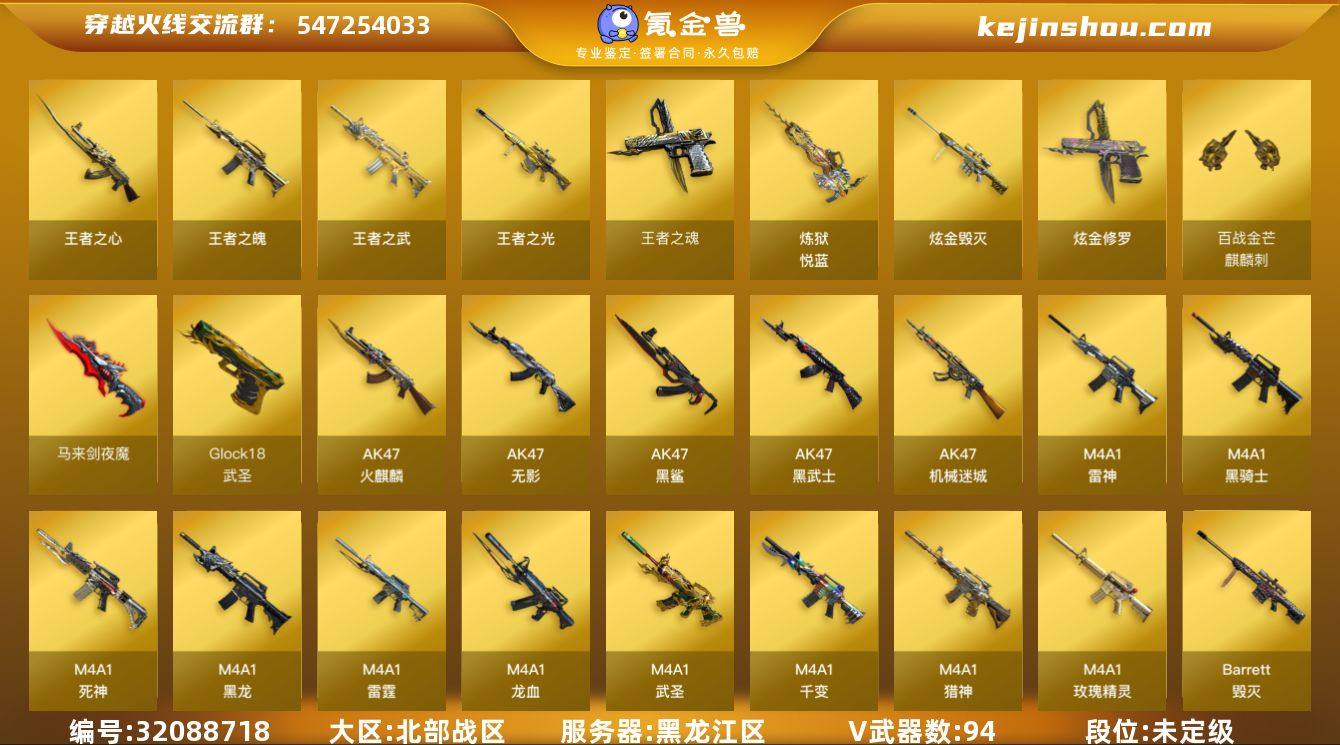 黑龙江区-101V-10王者武器数-3炫金武器数 【热门武器】:QBZ03-金色蔷薇,死亡之眼,M4A1-黑骑士*2,汤姆逊-烈龙*7,RPK-盘龙*5,加特林-炼狱*3,沙鹰-修罗 【王者炫金武器】:王者之武,王者之魄,王者之心,王者之光,炼狱-悦蓝,王者之魂,炫金骑士,炫金毁灭,炫金修罗 【音效卡】:Barrett-毁灭音效卡 【皮肤】:金色蔷薇-破浪逐光 皮肤,烈龙-星空,雷神-星空,雷神-源计划2.0专属 皮肤,毁灭耀金皮肤,毁灭-英雄计划 皮肤,黑龙-能量核心,AK47-黑武士-361,战神-紫绶金章皮肤,战神-流金岁月皮肤,天龙-能量核心,AWM-天龙-传奇白鲨,极光-能量核心,修罗耀金皮肤,屠龙-破浪逐光 皮肤 【角色】:葵,樱,炫,王者-魅影,北极狐-X,风暴女,零-水下丽影,灵狐者-X,灵狐者-黄金海岸,潘多拉-X,潜龙队-X,青霞仙子,铁骑荣耀,影武者-X 【人偶武器】:M37-葵,迷你深渊冰龙,迷你牛魔王,生化手雷-机甲核心*2,闪光弹-小乔 【暴走生化】:死亡之眼,超级对讲机 【挑战大师】:激光毁灭者III*2 【英雄级武器】:M4A1-千变,AK47-火麒麟*2,M4A1-黑龙,M4A1-雷神,M4A1-黑骑士*2,AK47-无影,M4A1-死神,AK47-黑武士,AK12-天启*4,AN94-超新星,M4A1-武圣,AK47-机械迷城*2,AK47-黑鲨,M4A1-龙血,M4A1-雷霆,M4A1-玫瑰精灵,QBZ03-金色蔷薇,M4A1-猎神,王者之势-觉醒版,王者之幻-觉醒版,AK47-B-战神,AWM-天龙,Barrett-毁灭,Barrett-极光*2,AWM-裁决,王者之光-觉醒版,RPK-盘龙*5,加特林-炼狱*3,汤姆逊-烈龙*7,AA-12-雷霆*2,沙鹰-修罗,沙鹰-天神*7,COP-雷霆,柯尔特-竞技荣光,Glock18-武圣,屠龙*2,龙啸*4,马来剑-夜魔,擎天*2,麒麟刺,擎天-竞技荣光,王者之啸-觉醒版,高爆手雷-雷霆*5,高爆手雷-夜魔,高爆手雷-竞技荣光,闪光弹-雷霆*5,闪光弹-夜魔,闪光弹