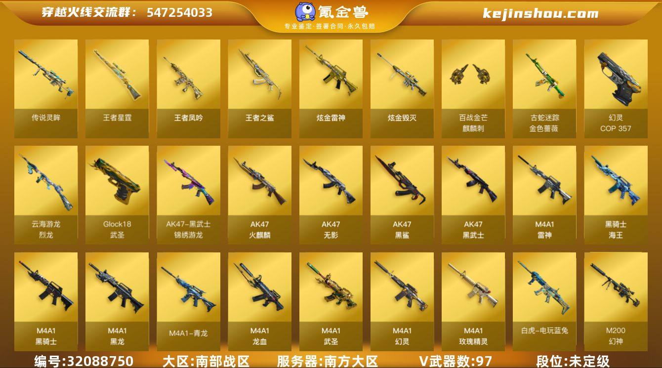 南方大区-111V-17王者武器数-4炫金武器数 【传说武器】:传说灵眸 【热门武器】:传说灵眸,G36C-幻影,QBZ03-金色蔷薇*2,M14EBR-玄武,M4A1-青龙,M200-幻神,金色蔷薇-古蛇迷踪,修罗-古蛇迷踪,白虎-电玩蓝兔,Kar98K-星神,毒蜂*2,M4A1-黑骑士,汤姆逊-烈龙*5,COP-白鲨,COP 357-幻灵*2,沙鹰-修罗*7,炽芒蝶刃*2 【王者炫金武器】:王者之鲨*2,王者凤吟,王者星霆,王者玉锋,炫金雷神,炫金武士*2,炫金毁灭 【音效卡】:屠龙-动感闪耀 音效卡,修罗-云海游龙音效卡,Barrett-极光音效卡,QBZ03-金色蔷薇音效卡,白鲨语音包,N9语音包,炼狱-百战金芒-庆典舞曲音效卡 【皮肤】:M200-幻神-荣耀世冠白鲨,幻神-动感闪耀 皮肤,幻神-电流骇客 皮肤,QBZ03-冠军之薇,QBZ03-荣耀世冠白鲨*2,QBZ03-金色蔷薇-斗鱼皮肤,裁决-流光秘银,裁决-羽掣 皮肤,裁决-运输船 皮肤,星神-璀璨皮肤,雷神-暗月,雷神-荣耀之魄,雷神-星空,雷神-传奇N9,雷神-维纳斯皮肤,雷神-源计划2.0专属 皮肤,雷神-化蛇 皮肤,雷神-诺拉 皮肤,M4A1-再燃火线,雷神-神秘按键 皮肤,传奇石头-横秒之巅,火麒麟-平天大圣,火麒麟-百城,毁灭-冠军之怒,毁灭-黑大圣皮肤,毁灭-航天科技皮肤,毁灭-英雄计划 皮肤,M4A1-黑龙-361,黑骑士耀金皮肤*2,无影耀金皮肤,无影-霓裳皮肤,黑武士-典韦皮肤,Barrett-金色蔷薇-蛇姬 皮肤,炼狱-星空,修罗-冠军之魂*3,屠龙-荣耀之锋*2,屠龙-荣耀世冠AG,屠龙-星火燎原,屠龙-春桃 皮肤,屠龙-惊鸿 皮肤,龙啸-蛇姬 皮肤,轻型军用手斧-再燃火线 【角色】:影豹,月兔特工,关小雨,王者-瞳-闭月羞花,王者-零-国色天香,王者复仇,王者涂鸦,王者影豹,王者-救世主,王者潘多拉,王者沙漠玫瑰,蛇隐宗,乔伊教练,云海玲珑,葵-阿尔法武装,暗夜-X,初恋灵狐,电竞少女,风暴女,疾风,兰-新...