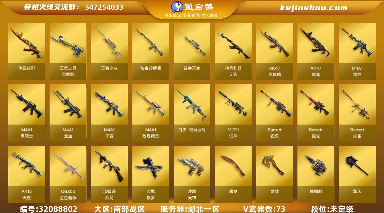 湖北一区-82V-13王者武器数-6炫金武器数 【传说武器】:传说夜影 【热门武器】:传说夜影,QBZ03-金色蔷薇,M200-幻神,白虎-电玩蓝兔,M4A1-黑骑士*2,汤姆逊-烈龙*3,加特林-炼狱*2,沙鹰-修罗,金刚伞 【王者炫金武器】:王者之决,炫金超新星*3,炫金天龙*3 【音效卡】:天神-动感闪耀 音效卡,Barrett-毁灭音效卡 【皮肤】:雷神-荣耀之魄,雷神-烈虎皮肤,雷神-机甲刑天皮肤,雷神-宇航兔皮肤,雷神-维纳斯皮肤,火麒麟-AG战队皮肤,火麒麟-雷神,火麒麟-平天大圣,火麒麟-百城,毁灭耀金皮肤,毁灭-黑曼巴 皮肤,黑骑士-破浪10年皮肤,战神-粉色甜心皮肤,AK47-B-常胜将军-曹操*2,AK47-B-常胜将军-刘备,AK47-B-常胜将军-孙权*2,天龙-能量核心,炼狱-月 皮肤,屠龙-荣耀之锋,麒麟刺-月皮肤 【角色】:魅影,炫,晴雅,王者葵-惊若翩鸿,乔伊教练,空,暗夜-X,北极狐-X,初恋灵狐,电竞少女,芳心审判者,风暴女,虎妞,嘉年华灵狐,兰-空鹰,兰妹妹,猎狐者-追月,灵狐-花神,灵狐者-七夕宝贝,灵狐者-职业经理,龙儿-小淘气,曼陀罗-X,曼陀罗-礼服,潘多拉-X,赛斯-X,兔囡囡,维纳斯,雪莉杨-摸金校尉,樱-战斗天使,影武者-X 【人偶武器】:M4A1-雷神-精英刀锋...