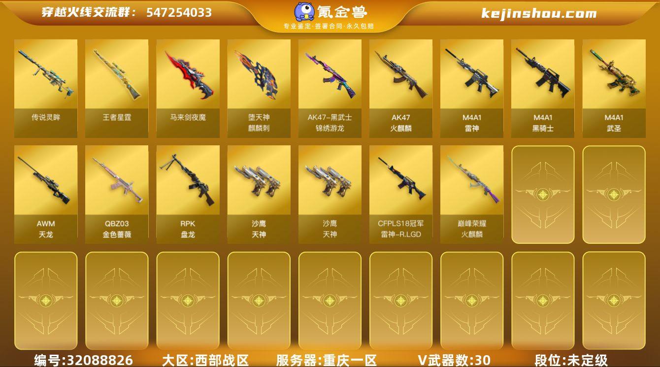 重庆一区-33V-2王者武器数-0炫金武器数 【传说武器】:传说灵眸 【热门武器】:传说灵眸,QBZ03-金色蔷薇,M4A1-黑骑士,RPK-盘龙 【王者炫金武器】:王者星霆 【音效卡】:烈火-动感闪耀 音效卡,炼狱-百战金芒-庆典舞曲音效卡,AWM-昌龙-怀旧音效卡 【皮肤】:QBZ03-AG-CFPLS19冠军,雷神-R.LGD-CFPLS18冠军,M4A1-再燃火线,火麒麟-巅峰荣耀,黑骑士-破浪10年皮肤,轻型军用手斧-再燃火线 【角色】:战地猎狐,蛇隐宗,奇洋探员,乔伊教练,修道士,空,北极狐-X,风暴女,虎妞,疾风,兰妹妹,青霞仙子,蛇姬,维纳斯,夜玫瑰-宠粉,影武者-X 【人偶武器】:COP-旗袍,迷你波特博士*2,迷你火种,迷你生化手雷,生化手雷-机甲核心 【暴走生化】:超级对讲机 【挑战大师】:激光毁灭者III-白马银枪 【英雄级武器】:AK47-火麒麟,M4A1-雷神,M4A1-黑骑士,M4A1-武圣*2,黑武士-锦绣游龙,QBZ03-金色蔷薇,AWM-天龙,RPK-盘龙,炼狱-百战金芒,炼狱-悦蓝-觉醒版,沙鹰-天神*3,麒麟刺-堕天神,马来剑-夜魔,麒麟刺-百战金芒,高爆手雷-堕天神,高爆手雷-夜魔,高爆手雷-竞技荣光,高爆手雷-古蛇迷踪,闪光弹-堕天神,闪光弹-夜魔,闪光弹-竞技荣光*2,烟雾弹-堕天神,烟雾弹-夜魔,烟雾弹-竞技荣光,M4A1-赤狱骑士,AWM-昌龙 【道具】:泡泡象背包,BS战队炫彩背包,CFS限定背包,亚洲杯纪念炫彩背包,奇洋探员-海龟背包,女皇终结者-背包,炫彩背包-诺拉,百战金芒炫彩背包,背包-洛丽塔,虎牙炫彩背包,超级背包,女皇终结者-魔龙之吻,救世主-黑桃战神,黄金生化钩,绿色巨人,灵魂忍者,迷雾幽灵,生化弹匣,夺命之镰,防化服*3,金色流光-枪王排位,星辰流光-枪王排位,流光-再燃火线,枪王排位28赛季金色流光,枪王排位29赛季金色流光,语音特效-盛典烟火,蛇隐宗表情,萌萌小葵表情,EP战队名片,EP战队...