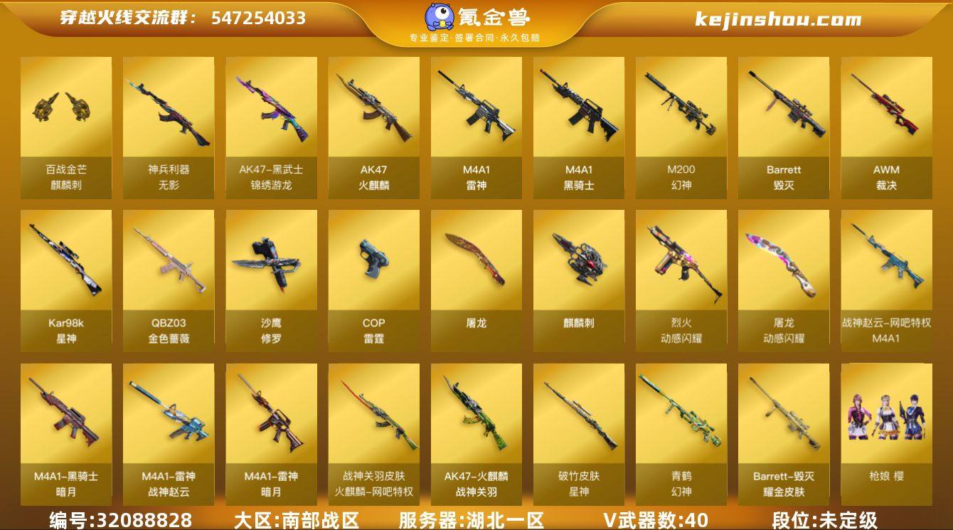 湖北一区-43V-1王者武器数-0炫金武器数 【热门武器】:QBZ03-金色蔷薇,M200-幻神,Kar98K-星神,M4A1-黑骑士,沙鹰-修罗*2 【王者炫金武器】:王者之魄闪光弹 【音效卡】:枪娘语音包-阿敏 【皮肤】:幻神-青鹤,幻神-宠儿-2021MVP,幻神-KZ-CFPLS25冠军 皮肤,QBZ03-AG-CFPLS19冠军,AWM-裁决-百城联赛天津皮肤,裁决-羽掣 皮肤,星神-破竹皮肤,星神-巅峰荣耀 皮肤,雷神-暗月,雷神-荣耀之魄,M4A1-战神赵云,火麒麟-战神关羽,火麒麟-心动糖果,毁灭耀金皮肤*2,黑骑士-暗月,极光-能量核心 【角色】:枪娘樱,乔伊教练,云海玲珑,暗夜-X,飞虎队-X,风暴女,嘉年华灵狐,灵狐-花神,麻雀,潘多拉-X,潘多拉-甜心教官,斯沃特-X,铁骑荣耀,游珑儿 【人偶武器】:生化手雷-机甲核心 【挑战大师】:冰龙粉碎者-白马银枪 【英雄级武器】:AK47-火麒麟*2,M4A1-雷神,M4A1-黑骑士,QBZ03-天罚,无影-神兵利器,黑武士-锦绣游龙,QBZ03-金色蔷薇,烈火-动感闪耀,Barrett-毁灭,AWM-裁决,M200-幻神,Kar98K-星神,沙鹰-修罗*2,COP-雷霆,天神-动感闪耀,屠龙,麒麟刺*2,屠龙-动感闪耀,高爆手雷-雷霆*5,手雷-动感闪耀,闪光弹-雷霆*6,烟雾弹-雷霆*5,M4A1-赤狱骑士 【道具】:EP战队炫彩背包,亚洲杯纪念炫彩背包,全能枪王背包,炫彩背包,救世主-黑桃战神,绿色巨人,灵魂忍者,迷雾幽灵,夺命之镰,防化服*2,金色流光-枪王排位*2,星辰流光-枪王排位,枪王排位28赛季金色流光,动感闪耀表情,防弹头盔*3,防弹衣*3,C4工具钳*3,手雷包*3 【特殊枪械】:1黑骑士