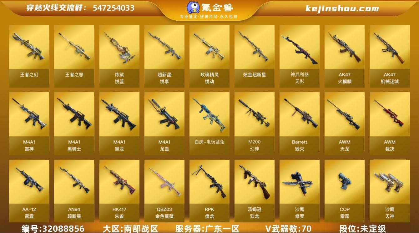 广东一区-75V-8王者-2炫金 【热门武器】:QBZ03-金色蔷薇,HK417-朱雀,M200-幻神,荣耀世冠-雷神,白虎-电玩蓝兔,炼狱-迷你小钢,M4A1-黑骑士,汤姆逊-烈龙*5,RPK-盘龙,火麒麟-绝迹,沙鹰-修罗*4 【王者炫金武器】:超新星-悦享,王者之幻,玫瑰精灵-悦动,王者之怒,炼狱-悦蓝,炫金武士,炫金超新星 【音效卡】:屠龙-动感闪耀 音效卡,天神-动感闪耀 音效卡,烈火-动感闪耀 音效卡,M200-幻神音效卡,Barrett-毁灭音效卡,Barrett-碧霄极光音效卡,炼狱-百战金芒-庆典舞曲音效卡,AWM-昌龙-怀旧音效卡 【皮肤】:M200-幻神-黄忠皮肤,幻神-丹凤,幻神-动感闪耀 皮肤,白虎-百战金芒 皮肤,金色蔷薇-电竞之星 皮肤,雷神-能量核心,雷神-荣耀之魄,雷神-星空,雷神-宇航兔皮肤,M4A1-再燃火线,火麒麟-雷神,火麒麟-战神关羽,火麒麟-荣耀世冠AG,火麒麟-心动糖果,毁灭-荣耀之怒,毁灭-星空,毁灭-战神张飞,毁灭-黑大圣皮肤,毁灭-巅峰荣耀 皮肤,毁灭-英雄计划 皮肤,黑骑士-暗月*2,无影耀金皮肤,战神-紫绶金章皮肤*2,AWM-天龙-传奇70KG,AWM-天龙-传奇白鲨*2,屠龙-荣耀之锋,屠龙-荣耀世冠AG,屠龙-巅峰荣耀 皮肤,轻型军用手斧-再燃火线 【角色】:樱,炫,战地猎狐,空,初恋灵狐,嘉年华灵狐,灵狐者-X,灵狐者-黄金海岸,灵狐者-七夕宝贝,龙儿-小淘气,曼陀罗-礼服,潘多拉-X,青霞仙子,斯沃特-X,铁骑荣耀,兔囡囡,樱-战斗天使 【人偶武器】:火麒麟-绝迹,炼狱-迷你小钢,AWM-灵狐-15周年嘉年华*2,夺魂,深渊终结者手雷,迷你超能女侍 【暴走生化】:超级对讲机 【挑战大师】:神圣爆裂者III,冰龙粉碎者-白马银枪,神圣爆裂者-末日III 【英雄级武器】:AK47-火麒麟*2,M4A1-黑龙,M4A1-雷神*3,M4A1-黑骑士,AN94-超新星,AK47-机械迷城,M4A1-龙血,HK417-朱雀,无影-神兵利器,QBZ03-...