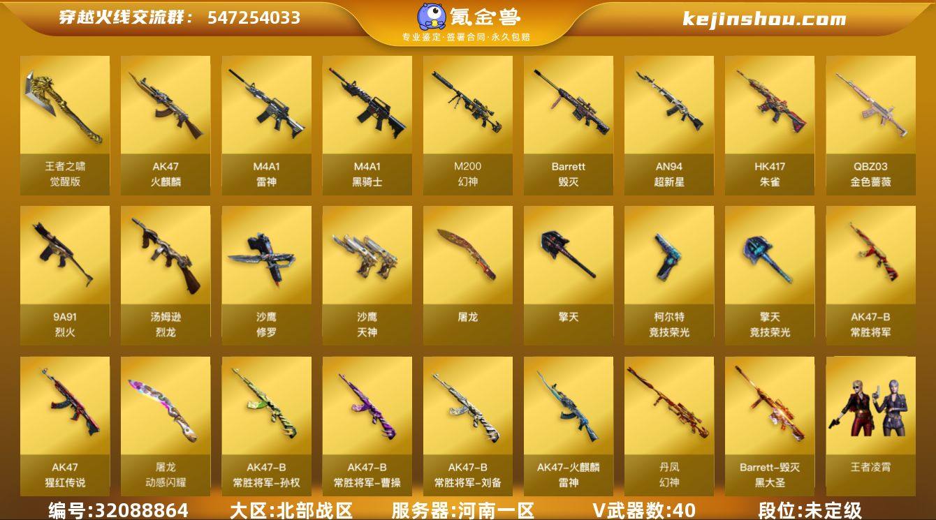 河南一区-48V-6王者武器数-0炫金武器数 【热门武器】:QBZ03-金色蔷薇,HK417-朱雀,M200-幻神,牛牛-AK47,M4A1-黑骑士,汤姆逊-烈龙*5,加特林-炼狱*2,斯泰尔-蝴蝶,沙鹰-修罗*3 【音效卡】:M200-幻神音效卡,M4A1-黑骑士音效卡,QBZ03-金色蔷薇音效卡 【皮肤】:幻神-丹凤,Scar Light-白虎-暗星,雷神-烈虎皮肤,火麒麟-雷神,毁灭-黑大圣皮肤,AK47-B-常胜将军-曹操,AK47-B-常胜将军-刘备,AK47-B-常胜将军-孙权 【角色】:雨棠,影豹,王者凌霄,王者玲珑-小乔,暗夜-X,初恋灵狐,芳心审判者,风暴女,虎妞,龙儿-小淘气,蜀雪 【人偶武器】:斯泰尔-蝴蝶,牛牛-AK47,夺魂,生化手雷-机甲核心,闪光弹-小乔,闪光弹-貂蝉,高爆手雷-大乔,迷你超能女侍 【挑战大师】:冰龙粉碎者-白马银枪*2 【英雄级武器】:AK47-火麒麟,M4A1-雷神,M4A1-黑骑士,AN94-超新星,HK417-朱雀,QBZ03-金色蔷薇,9A91-烈火,AK-47-猩红传说,AK47-B-常胜将军,机械迷城-穹宇,Barrett-毁灭*2,M200-幻神,王者星神-觉醒版,加特林-炼狱*2,汤姆逊-烈龙*5,沙鹰-修罗*3,沙鹰-天神,柯尔特-竞技荣光,屠龙,擎天,擎天-竞技荣光,王者之啸-觉醒版*3,高爆手雷-幻灵*5,高爆手雷-雷霆王者-觉醒版,闪光弹-幻灵,烟雾弹-幻灵*2 【道具】:超级背包,女皇终结者-魔龙之吻,夺命之镰,防化服,枪王排位28赛季金色流光,枪王排位29赛季金色流光,电玩兔兔表情,防弹头盔,防弹衣,C4工具钳,手雷包 【特殊枪械】:蝴蝶斯泰尔+5烈龙,1黑骑士,5烈龙,2炼狱,1蝴蝶斯泰尔