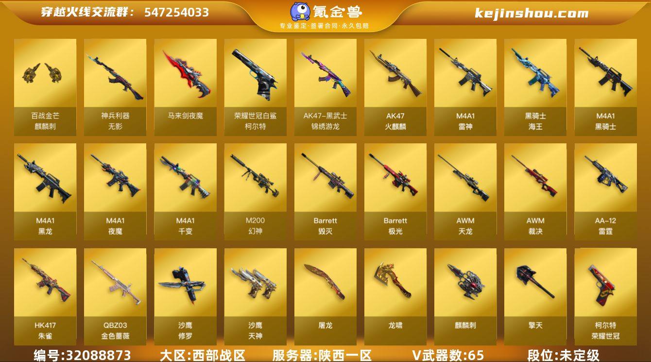 陕西一区-70V-6王者-0炫金 【热门武器】:QBZ03-金色蔷薇,HK417-朱雀,M200-幻神,荣耀世冠-柯尔特,M4A1-黑骑士*2,USP-雷暴,沙鹰-修罗*2 【音效卡】:AK47-火麒麟音效卡,M4A1-雷神音效卡,M4A1-黑骑士音效卡,Barrett-毁灭音效卡,Barrett-碧霄极光音效卡*2,白虎-盛典舞曲音效卡,炼狱-百战金芒-庆典舞曲音效卡 【皮肤】:幻神-丹凤,幻神-青鹤,幻神-KZ-CFPLS25冠军 皮肤,QBZ03-荣耀世冠白鲨,QBZ03-CFS2024 皮肤*2,Kar98K-星神-AG-CFPLS21冠军皮肤,雷神-冠军之魄,雷神-CFS十周年纪念版 皮肤,M4A1-再燃火线,火麒麟-雷神*2,火麒麟-平天大圣,火麒麟-心动糖果,毁灭-CFS2020,黑龙-暗月,屠龙-巅峰荣耀 皮肤,轻型军用手斧-再燃火线,麒麟刺-甜蜜糖果 皮肤 【角色】:零,迷迭香,电竞教官-云悠悠,王者-瞳-闭月羞花,王者-零,王者玲珑,乔伊教练,云海玲珑,初恋灵狐,电竞少女,嘉年华灵狐,娟娟,猎狐者-追月,零-水下丽影,灵狐者-X,麻雀,潘多拉-X,潘多拉-甜心教官,莎莎,斯沃特-X,铁骑荣耀,樱-战斗天使,影武者-X,游珑儿 【人偶武器】:AWM-灵狐-15周年嘉年华,迷你深渊冰龙*2,迷你波特博士,夺魂,深渊终结者手雷,迷你艾比 【暴走生化】:超级对讲机 【挑战大师】:AK47-冰龙粉碎者,冰龙粉碎者-白马银枪,VEPR-12-金魔,激光毁灭者III,神圣爆裂者-末日III 【英雄级武器】:M4A1-千变,AK47-火麒麟*2,M4A1-黑龙,M4A1-雷神*3,M4A1-黑骑士*2,HK417-朱雀,M4A1-夜魔,无影-神兵利器,黑武士-锦绣游龙,QBZ03-金色蔷薇,王者之心-觉醒版,王者之魄-觉醒版,黑骑士-海王,AWM-天龙*3,Barrett-毁灭,Barrett-极光,AWM-裁决,M200-幻神,王者之怒-觉醒版,王者之力-觉醒版,炼狱-百战金芒,AA-12-雷霆,沙鹰-修罗*2,沙鹰-天神,USP-雷暴,荣耀世