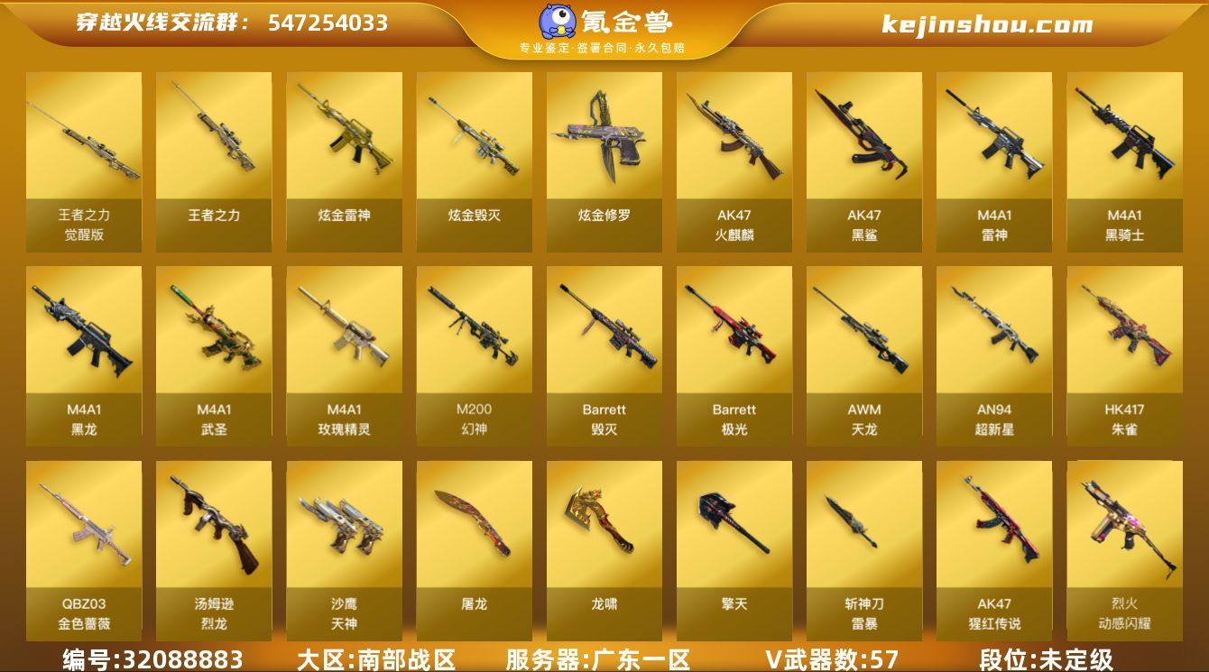 广东一区-62V-4王者武器数-3炫金武器数 【热门武器】:QBZ03-金色蔷薇*3,HK417-朱雀,M200-幻神,M4A1-黑骑士*2,汤姆逊-烈龙*2,Knife-冠军之刃 【王者炫金武器】:王者之力,炫金雷神,炫金毁灭,炫金修罗 【皮肤】:M200-幻神-黄忠皮肤,幻神-冠军之幻,幻神-荣耀世冠EP 皮肤,QBZ03-荣耀世冠白鲨,QBZ03-巅峰荣耀皮肤,QBZ03-荣耀世冠EP 皮肤,烈龙-星空,雷神-荣耀之魄,雷神-星空,雷神-虎将,雷神-维纳斯皮肤,火麒麟-华夏之心,火麒麟-平天大圣,毁灭-星空*2,毁灭-冠军之怒,黑骑士-AG-S4冠军典藏,黑骑士-破浪10年皮肤,无影耀金皮肤,修罗-能量核心*2 【角色】:葵,妮妮,王者凌霄,乔伊教练,初恋灵狐,电竞少女,芳心审判者,风暴女,兰-海滩派对,灵动武士,灵狐-花神,灵狐者-X,灵狐者-职业经理,曼陀罗-礼服,铁骑荣耀,维纳斯,幽,游珑儿 【人偶武器】:白虎-迷你小艾 【挑战大师】:神圣爆裂者III,激光毁灭者III 【英雄级武器】:AK47-火麒麟,M4A1-黑龙*3,M4A1-雷神*2,M4A1-黑骑士*2,AN94-超新星*2,M4A1-武圣*2,AK47-黑鲨,HK417-朱雀,M4A1-玫瑰精灵,QBZ03-金色蔷薇*3,烈火-动感闪耀,AK-47-猩红传说,王者白虎-觉醒版,王者芳薇-觉醒版,AWM-天龙,Barrett-毁灭,Barrett-极光,M200-幻神,王者之力-觉醒版,汤姆逊-烈龙*2,沙鹰-天神*5,天神-动感闪耀,屠龙*3,龙啸*2,擎天,屠龙-动感闪耀,斩神刀-雷暴,高爆手雷-雷霆,高爆手雷-雷暴*2,手雷-动感闪耀,高爆手雷-云龙,闪光弹-雷霆,闪光弹-雷暴*2,闪光弹-云龙,烟雾弹-雷霆,烟雾弹-雷暴*2,烟雾弹-云龙,烟雾弹-荣耀世冠EP,M4A1-赤狱骑士 【道具】:炫彩背包,哔哩哔哩名片,女皇终结者-魔龙之吻,救世主-黑桃战神,绿色巨人,灵魂忍者,迷雾幽灵,夺命之镰,防化服*2,金色流光-枪王排位*2,星辰流光-枪王排位,流光-...