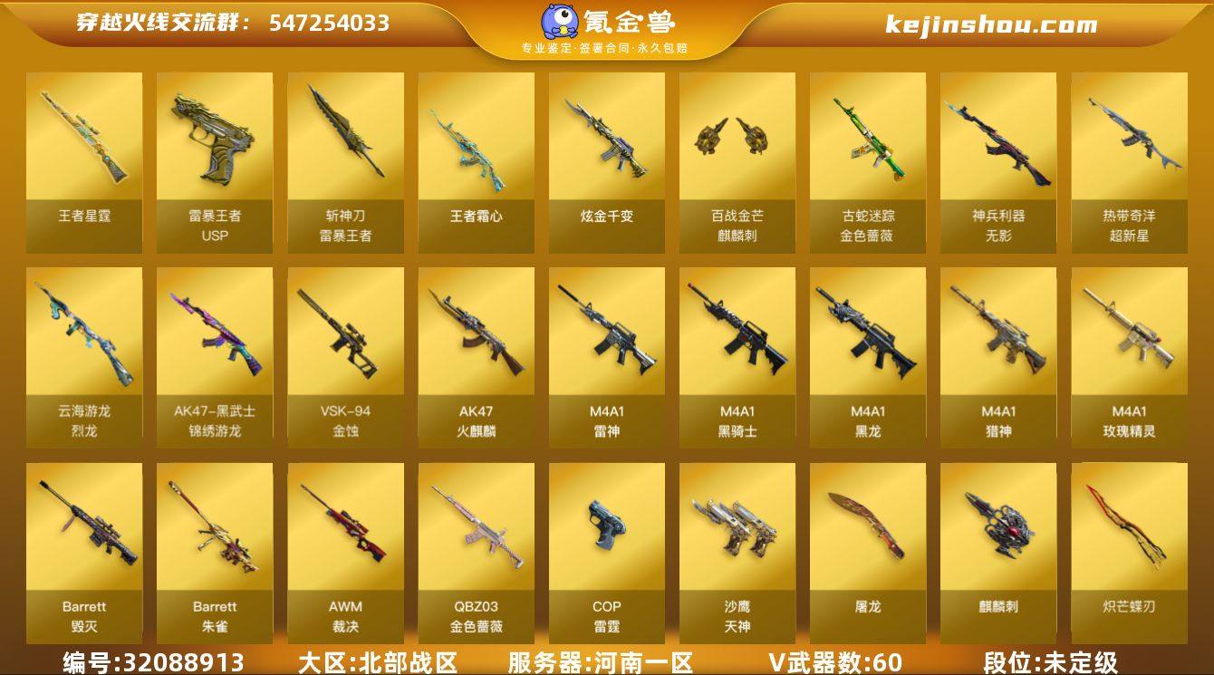 河南一区-64V-12王者武器数-1炫金武器数 【传说角色】:传说影煞 【热门武器】:QBZ03-金色蔷薇,金色蔷薇-古蛇迷踪,修罗-古蛇迷踪,M200-竞技荣光,M4A1-黑骑士,裁决-雪莉杨,炽芒蝶刃 【王者炫金武器】:王者霜心,王者星霆,USP-雷暴王者,斩神刀-雷暴王者,炫金千变,王者之魄高爆手雷 【音效卡】:天神-动感闪耀 音效卡,烈龙-云海游龙音效卡,修罗-古蛇迷踪音效卡,M4A1-黑骑士音效卡,Barrett-毁灭音效卡,白虎-盛典舞曲音效卡,炼狱-百战金芒-庆典舞曲音效卡,死神-雪域霜狐-怀旧音效卡,柯尔特-百战金芒-庆典舞曲音效卡 【皮肤】:QBZ03-AG-CFPLS19冠军,金色蔷薇-电竞之星 皮肤,裁决-流光秘银,AWM-裁决-百城联赛天津皮肤,裁决-胜者为王 皮肤,雷神-暗月,雷神-虎将,雷神-R.LGD-CFPLS18冠军,雷神-诺拉 皮肤,M4A1-再燃火线,雷神-神秘按键 皮肤,火麒麟-心动糖果,毁灭耀金皮肤,毁灭-黑大圣皮肤,毁灭-英雄计划 皮肤,黑骑士耀金皮肤,Barrett-金色蔷薇-蛇姬 皮肤,屠龙-惊鸿 皮肤,轻型军用手斧-再燃火线,龙啸-青青莓果 皮肤,麒麟刺-月皮肤 【角色】:电竞教官-云悠悠,妮妮,战地猎狐,王者-瞳-闭月羞花,王者樱-热浪之夏,王者-迷迭香,雪域霜狐,蛇隐宗,奇洋探员,乔伊教练,云海玲珑,葵-阿尔法武装,暗夜-X,北极狐-X,初恋灵狐,电竞少女,芳心审判者,飞虎队-X,风暴女,虎妞,嘉年华灵狐,疾风,猎狐者-追月,零-热舞青春,零-水下丽影,灵狐-花神,灵狐者-X,龙儿,麻雀,萌儿,娜塔莉娅,潘多拉-X,潘多拉-甜心教官,蛇姬,斯沃特-X,蜀雪,兔囡囡,维纳斯,新娜塔莎,雪莉杨,夜玫瑰-幻能朋克,影武者-X,游珑儿 【人偶武器】:裁决-雪莉杨,火麒麟-灵狐*2,迷你宝贝,迷你钢铁终结者,迷你救赎猎手,Scar Light-马枪,迷你地狱终结者,AWM-灵狐-15周年嘉年华*2,COP-旗袍,迷你...