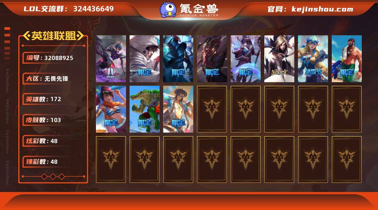 THL793【区服网通无畏先锋 段位黄铜 皮肤数量103 炫彩48 终极 神话1 传说14 限定21】172英雄-103皮肤 胜利行刑官德莱文 泳池派对雷克顿 都铎王朝老鼠 泳池派对格雷福斯 泳池派对菲奥娜 海之歌永恩 11周年卡蜜尔 冬季仙境奶妈 S8IG卡莎 S4SSW泰隆 S5SKT T1阿兹尔 S6SKTT1奥拉夫 S7SSG嘉文四世 鬼影重重魔腾 幻灵战斗队长女枪 源计划:联合艾希 女帝卡特琳娜 绝息圣堂锐雯 黑夜使者亚索 源计划:泯灭雷克顿 战地机甲厄加特 焰尾妖狐阿狸 神拳李青 西部魔影卢锡安 真实伤害艾克 墨之影武者易 神王德莱厄斯 霓虹杀拳蔚 铁血剑豪易 铁血猎手豹女 飞车暴走族酒桶 源代码索拉卡 法国皇室女枪 勇敢的心奎因 至高君王玛尔扎哈 三昧真火孙悟空 特战先锋赵信 黑帮狂花金克丝 黑帮教父格雷福斯 源计划:自由艾克 圣光审判凯尔