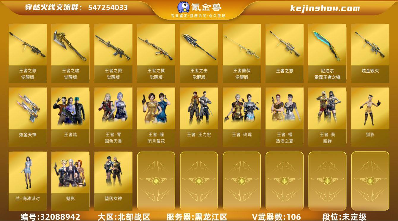 DYCF083【111V 王者幻神 SL白虎 8烈龙】【等级】100【区服】黑龙江区【VIP】2【英雄角色】5【英雄武器】106【王者级武器】QBZ-03-王者蔷薇-觉醒版 COP 357-雷霆王者-觉醒版 闪光弹-雷霆王者-觉醒版 雷霆王者之锋 王者幻神-觉醒版 高爆手雷-雷霆王者 王者之幻 王者之怒-觉醒版 王者之力 王者之翼 王者之击 王者之啸【炫金级武器】炫金骑士 炫金天神 炫金毁灭【英雄级角色】葵 樱 魅影 炫 幻面灵狐【英雄级武器】炽芒蝶刃 M4A1-猎神 HK417-朱雀-电竞之星 M4A1-青龙 屠龙-电竞之星 9A91-烈火 9A91-烈火 9A91-烈火 烟雾弹-荣耀世冠EP 闪光弹-竞技荣光 烟雾弹-竞技荣光 高爆手雷-竞技荣光 马来剑-夜魔 烟雾弹-夜魔 高爆手雷-夜魔 闪光弹-夜魔 烟雾弹-幻灵 烟雾弹-幻灵 天神-CF网剧冠军 黑武士-CF网剧冠军 擎天-CF网剧冠军 Scar Light-白虎 USP-雷暴 高爆手雷-雷暴 烟雾弹-雷暴 闪光弹-雷暴 高爆手雷-雷暴 烟雾弹-雷暴 闪光弹-雷暴 高爆手雷-雷暴 烟雾弹-雷暴 闪光弹-雷暴 AK47-火麒麟 屠龙 沙鹰-修罗 汤姆逊-烈龙 屠龙 AK47-火麒麟 汤姆逊-烈龙 屠龙 屠龙 M4A1-龙血 斩神刀-雷暴 AA-12-雷霆 高爆手雷-雷暴 烟雾弹-雷暴 闪光弹-雷暴 AA-12-雷霆 AK47-黑鲨 AWM-裁决 加特林-炼狱 QBZ03-金色蔷薇 加特林-炼狱 M4A1-黑龙 麒麟刺 M4A1-龙血 雷霆之锋 高爆手雷-雷霆 烟雾弹-雷霆 闪光弹-雷霆 AWM-裁决 9A91-烈火 AK12-天启 汤姆逊-烈龙 AK47-无影 汤姆逊-烈龙 AN94-超新星 M4A1-武圣 Glock18-武圣 AK47-黑武士 屠龙 QBZ03-金色蔷薇 barrett-金色蔷薇 屠龙 M4A1-黑骑士 M4A1-黑骑士 QBZ03-金色蔷薇 barrett-金色蔷薇 barrett-金色蔷薇 擎天 沙鹰-修罗 AK12-天启 汤姆逊-烈龙 汤姆逊-烈龙 汤姆逊-烈龙 麒
