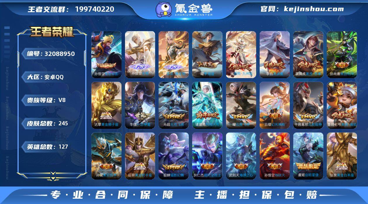 安卓Q-V8-最强王者段位-127英雄-245皮肤-1典藏皮肤-2无双-21传说-75史诗 【荣耀典藏】:孙悟空全息碎影 【无双皮肤】:孙悟空无相,曜器灵螭龙剑 【传说皮肤】:澜愿照九州拓,云缨幻光神枪,马超无双飞将,孙策末日机甲,裴擒虎寅虎赤拳,鲁班七号寅虎瑞焰,曜李逍遥 ,诸葛亮时雨天司,虞姬启明星使,曜云鹰飞将,李信一念神魔,貂蝉猫影幻舞,张良黄金白羊座,干将莫邪久胜战神,达摩黄金狮子座,后羿黄金射手座,李白凤求凰,孙尚香末日机甲,孙悟空地狱火,武则天海洋之心,狄仁杰超时空战士 【限定皮肤】:狄仁杰阴阳师,赵云皇家上将,嬴政优雅恋人,鲁班七号寅虎瑞焰,庄周高山流水,高渐离玩趣恶龙,白起夜都怪侠,芈月白晶晶,芈月幻夜卜梦,周瑜赤莲之焰,元歌无心,夏侯惇朔风刀,曹操天狼征服者,马可波罗逐梦之星,马可波罗暗影游猎,狄仁杰魔术师,狄仁杰万华元夜,达摩星际陆战队,达摩沙漠行僧,项羽海滩派对,老夫子醍醐杖,关羽冰锋战神,程咬金演武夺筹,露娜一生所爱,王昭君凤凰于飞,王昭君午后时光,兰陵王驯魔猎人,兰陵王金庭之子,花木兰青春决赛季,李元芳云中旅人,虞姬启明星使,钟馗驱傩正仪,雅典娜单词大作战,蔡文姬繁星吟游,鬼谷子原初探秘者,鬼谷子五谷丰年,诸葛亮时雨天司,黄忠火炮绅士,铠青龙志,苏烈千军破阵,百里守约朱雀志,弈星混沌棋,梦奇顽趣,沈梦溪大漠名商,明世隐疑决卦,明世隐吟游魔法,裴擒虎天狼狩猎者,裴擒虎李小龙,裴擒虎寅虎赤拳,裴擒虎擒涛扼浪,狂铁电玩高手,米莱狄胡桃异想国,伽罗天狼溯光者,猪八戒西部大镖客,猪八戒猪悟能,嫦娥拒霜思,曜李逍遥 ,蒙犽狂想玩偶喵,鲁班大师探海日志,桑启海盐诗旅,张良古海寻踪,鬼谷子天穹祈灯,鲁班七号蔬乡物语 【年限皮肤】:王昭君凤凰于飞,李白凤求凰,百里守约朱雀志,铠青龙志,诸葛亮时雨...