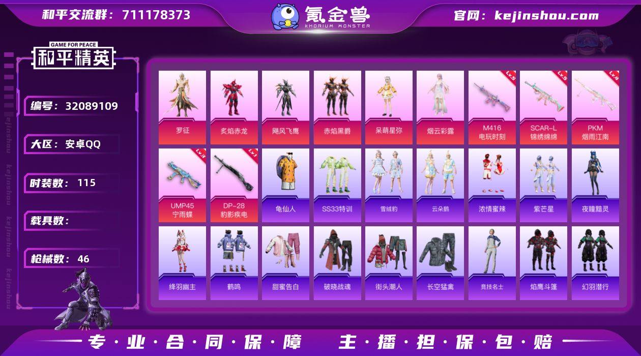 0载具-29套装-46枪皮-1王牌印记-6粉装-5特效枪-16215热力值-29套装-46枪皮【6粉装】角色-罗征,套装-赤焰黑爵,角色-烟云彩露,角色-呆萌星弥,套装-飓风飞鹰,套装-炙焰赤龙【5特效枪】M416-电玩时刻/5级,SCAR-L-锦绣绵绵/5级,PKM-江南烟雨/4级,UMP45-宁雨蝶/3级,DP-28-豹影疾电/1级【1稀有紫装】龟仙人【29稀有时装】罗征,SS33特训,雪绒豹,夜瞳黯灵,绛羽幽主,龟仙人,云朵鹅,炙焰赤龙,飓风飞鹰,赤焰黑爵,烟云彩露,呆萌星弥,舰行太空,焰鹰斗篷,湖雨初晴,蝶吟花词,浓情蜜辣,竞技名士,长空猛禽,甜蜜告白,街头潮人,春光漫游,狙击之神,快闪甜心,破晓战魂,SS27特训,紫芒星,幻羽潜行,鹤鸣 【46稀有枪械】Vector-创世·救赎,UMP45-宁雨蝶/3级,DP-28-豹影疾电/1级,M416-电玩时刻/5级,SCAR-L-锦绣绵绵/5级,PKM-江南烟雨/4级,撬棍-冷漠罗丽,M762-云朵鹅,SVD-云朵鹅,M249-绯穹魔姬,撬棍-咒蚀之裁,Mini14-绯穹魔姬,AKS-74U-乌木金纹,Famas-乌木金纹,SPAS-12-云朵鹅,沙漠之鹰-云朵鹅,大砍刀-云朵鹅,DBS-荧海星豚,M416-红色方程式,M416-蓝色火焰,AKM-江南烟雨,SCAR-L-炫彩节奏,M16A4-天使羽翼,G36C-镜域双华,AC-VAL-快闪甜心,蜜獾-天降萌叽,Kar98K-洛神天依,AWM-焰鹰斗篷,AMR-乌木金纹,AMR-白勺歌姬,MK20-H-快闪甜心,UZI-天降萌叽,Vector-焰鹰斗篷,MP5K-乌木金纹,P90-快闪甜心,S686-白勺歌姬,DBS-焰鹰斗篷,DP-28-焰鹰斗篷,DP-28-古战神甲,MG3-镜域双华,沙漠之鹰-快闪甜心,TMP-9-江南烟雨,平底锅-快闪甜心,平底锅-焰鹰斗篷,撬棍-环太平洋,战术弩-江南烟雨 【1稀有飞行器】镜域双华-灵镜之阶 【8稀有背包】冷漠罗丽背包(3级),喜羊羊与灰太狼背包(3级),古战神甲背包(3级),龟仙人龟壳背包(3级),焰鹰斗篷背包(3级),镜域双华背包(3级),蜜语绒猫背包(3级),江南烟雨背包(3级)