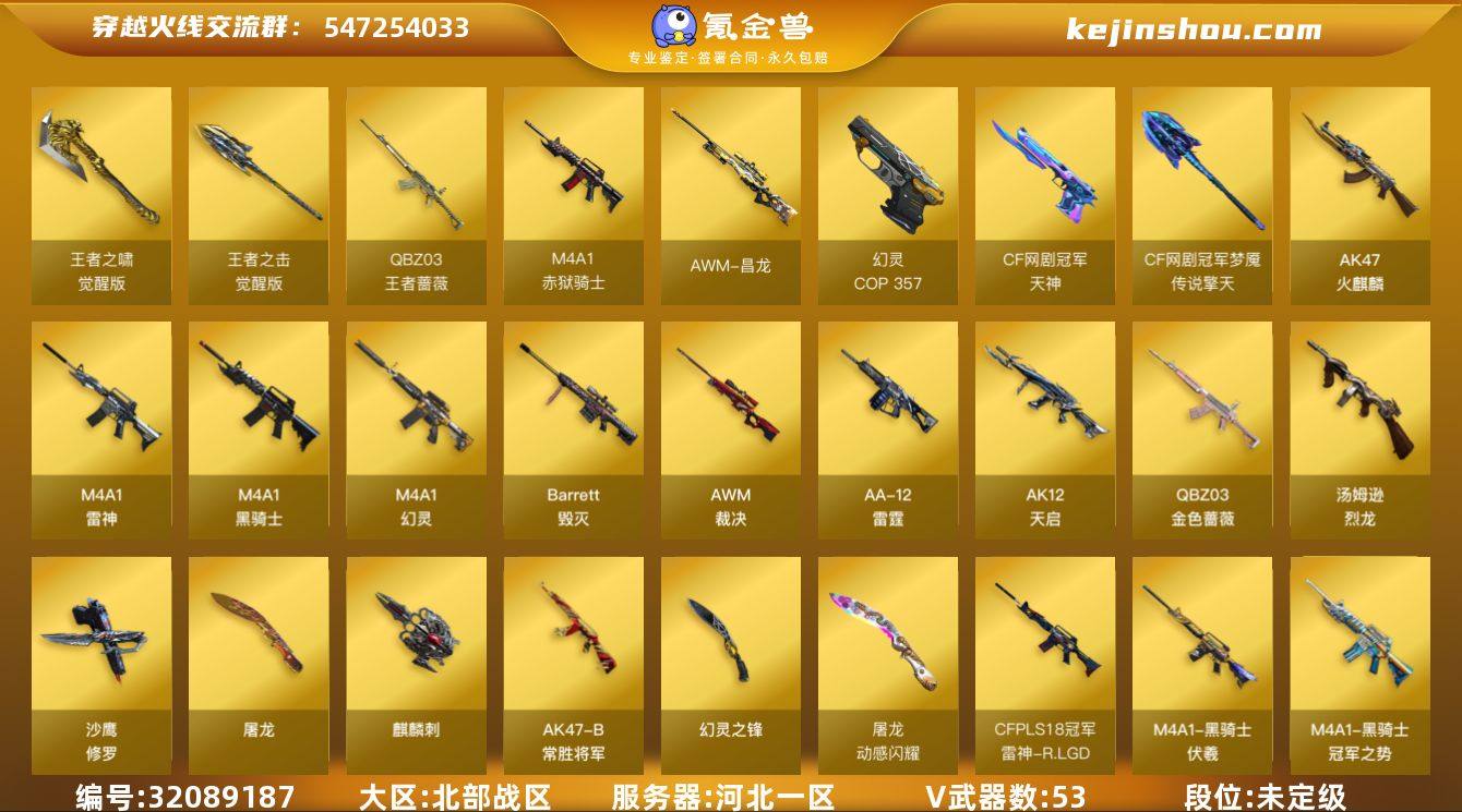 河北一区-61V-4王者武器数-0炫金武器数 【热门武器】:QBZ03-金色蔷薇,QBZ-03-王者蔷薇,死亡之眼,M4A1-黑骑士,汤姆逊-烈龙*5,COP 357-幻灵*2,沙鹰-修罗*4 【王者炫金武器】:QBZ-03-王者蔷薇 【音效卡】:M4A1-黑骑士音效卡,Barrett-毁灭音效卡,AWM-昌龙-怀旧音效卡 【皮肤】:M4A1-雷神-CFS 2019,雷神-R.LGD-CFPLS18冠军,火麒麟-白虎,毁灭耀金皮肤,毁灭-英雄计划 皮肤,黑骑士-冠军之势,黑骑士-伏羲,AK47-B-常胜将军-曹操,AK47-B-常胜将军-孙权*2,极光-能量核心,麒麟刺-甜蜜糖果 皮肤 【角色】:魅影,影豹,战地猎狐,王者-葵-貂蝉,王者玲珑,修道士,娟娟,灵狐者-职业经理,铁骑荣耀,兔囡囡,樱-缤纷夏日 【人偶武器】:闪光弹-貂蝉,高爆手雷-大乔 【暴走生化】:死亡之眼 【挑战大师】:AK47-冰龙粉碎者 【英雄级武器】:AK47-火麒麟,M4A1-雷神,M4A1-黑骑士,AK12-天启,M4A1-幻灵,QBZ03-金色蔷薇,AK47-B-常胜将军,黑武士-CF网剧冠军,机械迷城-穹宇,Barrett-毁灭,AWM-裁决,王者幻神-觉醒版,汤姆逊-烈龙*5,AA-12-雷霆,沙鹰-修罗*4,COP 357-幻灵*2,天神-CF网剧冠军,屠龙,麒麟刺,幻灵之锋,擎天-CF网剧冠军,王者之啸-觉醒版,王者之击-觉醒版,高爆手雷-幻灵*7,闪光弹-幻灵*6,闪光弹-量子之心,烟雾弹-幻灵*5,烟雾弹-量子之心,M4A1-赤狱骑士,AWM-昌龙 【道具】:BS战队炫彩背包,Q9战队炫彩背包,亚洲杯纪念炫彩背包,炫彩背包,超级背包,女皇终结者-魔龙之吻,救世主-黑桃战神,绿色巨人,灵魂忍者,变异宝贝,迷雾幽灵,夺命之镰,防化服*3,枪王排位29赛季金色流光,防弹头盔*3,防弹衣*3,C4工具钳*3,手雷包*3 【特殊枪械】:1黑骑士,5烈龙
