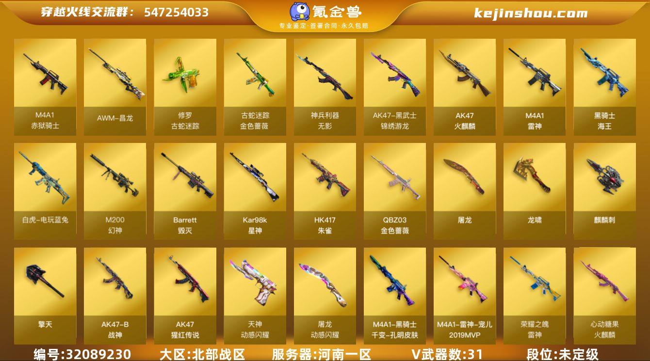 河南一区-33V-21王者武器数-0炫金武器数 【热门武器】:QBZ03-金色蔷薇,HK417-朱雀,M200-幻神,金色蔷薇-古蛇迷踪,修罗-古蛇迷踪,死亡之眼,白虎-电玩蓝兔,Kar98K-星神 【音效卡】:火线妹语音包 【皮肤】:幻神-荣耀世冠EP 皮肤,白虎-AG-CFPLS20冠军,QBZ03-荣耀世冠EP 皮肤,星神-漫游,雷神-荣耀之魄,雷神-宠儿-2019MVP,火麒麟-平天大圣,火麒麟-心动糖果,毁灭-SV-CFPLS16冠军,毁灭-BEAN-2020MVP,毁灭-黑大圣皮肤,毁灭-直播专属,M4A1-千变-孔明皮肤,战神-紫绶金章皮肤,AK47-B-常胜将军-孙权,天神-暗月,龙啸-冠军之啸,擎天-秘银,麒麟刺-甜蜜糖果 皮肤 【角色】:电竞教官-云悠悠,战地猎狐,王者凌霄,蛇隐宗,乔伊教练,暗夜-X,初恋灵狐,芳心审判者,风暴女,嘉年华灵狐,娟娟,灵狐者-七夕宝贝,龙儿-小淘气,曼陀罗-礼服,女主播,潘多拉-X,潘多拉-甜心教官,邱刚敖,蛇姬,斯沃特-X,兔囡囡,樱-战斗天使,职业选手 【人偶武器】:天龙-曼陀罗,AWM-灵狐-15周年嘉年华,迷你深渊冰龙,迷你裂空之翼,迷你牛魔王,夺魂,迷你牛牛,深渊终结者手雷,迷你深渊冰龙-王绿豆,迷你超能女侍 【暴走生化】:黑龙吞噬者,死亡之眼,超级对讲机 【挑战大师】:神圣爆裂者III,冰龙粉碎者-白马银枪,激光毁灭者III,试炼破坏者III,神圣爆裂者-末日III*3 【英雄级武器】:AK47-火麒麟,M4A1-雷神,HK417-朱雀,QBZ03-天罚,无影-神兵利器,黑武士-锦绣游龙,金色蔷薇-古蛇迷踪,QBZ03-金色蔷薇,AK-47-猩红传说,AK47-B-战神,黑骑士-海王,白虎-电玩蓝兔,Barrett-毁灭,M200-幻神,Kar98K-星神,王者之光-觉醒版,柯尔特-荣耀世冠EP,天神-动感闪耀,修罗-古蛇迷踪,屠龙,龙啸,擎天,麒麟刺*2,高爆手雷-幻灵,手雷-动感闪耀,高爆手雷-古蛇迷踪,闪光弹-幻灵,烟雾弹-幻灵,烟雾弹-古蛇迷踪...
